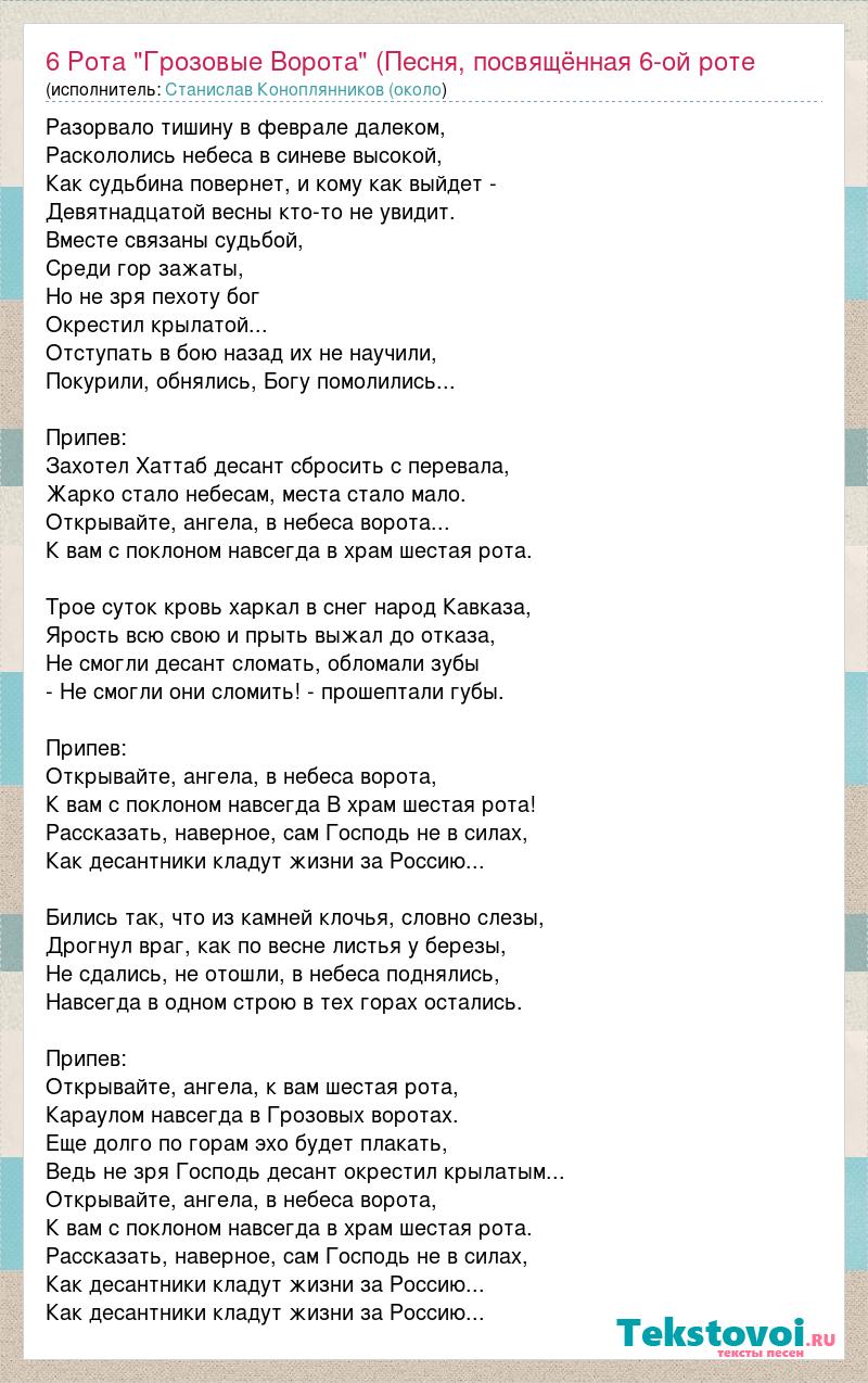 Разорвало тишину в феврале далеком, Раскололись небеса в синеве высокой, Как судьбина повернет, и кому как выйдет - Девятнадцатой весны кто-то не увидит. Вместе связаны судьбой, Среди гор зажаты, Но не зря пехоту бог Окрестил крылатой... Отступать в бою назад их не научили, Покурили, обнялись, Богу помолились... Припев: Захотел Хаттаб десант сбросить с перевала, Жарко стало небесам, места стало мало. Открывайте, ангела, в небеса ворота... К вам с поклоном навсегда в храм шестая рота. Трое суток кровь харкал в снег народ Кавказа, Ярость всю свою и прыть выжал до отказа, Не смогли десант сломать, обломали зубы - Не смогли они сломить! - прошептали губы. Припев: Открывайте, ангела, в небеса ворота, К вам с поклоном навсегда В храм шестая рота! Рассказать, наверное, сам Господь не в силах, Как десантники кладут жизни за Россию... Бились так, что из камней клочья, словно слезы, Дрогнул враг, как по весне листья у березы, Не сдались, не отошли, в небеса поднялись, Навсегда в одном строю в тех горах остались. Припев: Открывайте, ангела, к вам шестая рота, Караулом навсегда в Грозовых воротах. Еще долго по горам эхо будет плакать, Ведь не зря Господь десант окрестил крылатым... Открывайте, ангела, в небеса ворота, К вам с поклоном навсегда в храм шестая рота. Рассказать, наверное, сам Господь не в силах, Как десантники кладут жизни за Россию... Как десантники кладут жизни за Россию...