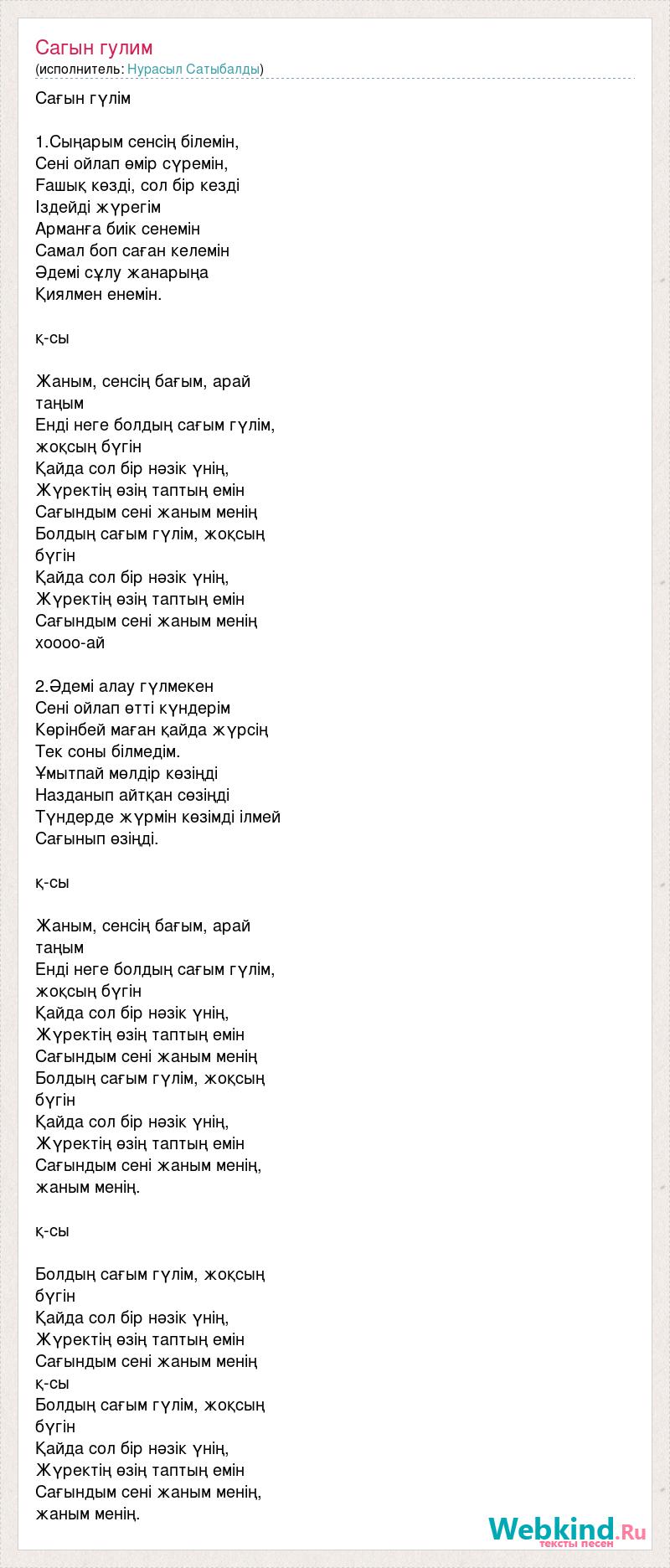 Сағын гүлiм 1.Сыңарым сенсің білемін, Сені ойлап өмір сүремін, Fашық көзді, сол бір кезді Іздейді жүрегім Арманға биік сенемін Самал боп саған келемін Әдемі сұлу жанарыңа Қиялмен енемін. қ-сы Жаным, сенсің бағым, арай таңым Енді неге болдың сағым гүлім, жоқсың бүгін Қайда сол бір нәзік үнің, Жүректің өзің таптың емін Сағындым сені жаным менің Болдың сағым гүлім, жоқсың бүгін Қайда сол бір нәзік үнің, Жүректің өзің таптың емін Сағындым сені жаным менің хоооо-ай 2.Әдемі алау гүлмекен Сені ойлап өтті күндерім Көрінбей маған қайда жүрсің Тек соны білмедім. Ұмытпай мөлдір көзіңді Назданып айтқан сөзіңді Түндерде жүрмін көзімді ілмей Сағынып өзіңді. қ-сы Жаным, сенсің бағым, арай таңым Енді неге болдың сағым гүлім, жоқсың бүгін Қайда сол бір нәзік үнің, Жүректің өзің таптың емін Сағындым сені жаным менің Болдың сағым гүлім, жоқсың бүгін Қайда сол бір нәзік үнің, Жүректің өзің таптың емін Сағындым сені жаным менің, жаным менің. қ-сы Болдың сағым гүлім, жоқсың бүгін Қайда сол бір нәзік үнің, Жүректің өзің таптың емін Сағындым сені жаным менің қ-сы Болдың сағым гүлім, жоқсың бүгін Қайда сол бір нәзік үнің, Жүректің өзің таптың емін Сағындым сені жаным менің, жаным менің.