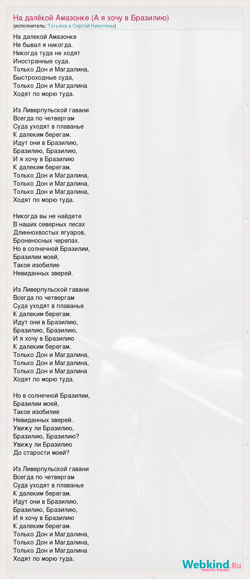 На далекой Амазонке Не бывал я никогда. Никогда туда не ходят Иностранные суда. Только Дон и Магдалина, Быстроходные суда, Только Дон и Магдалина Ходят по морю туда. Из Ливерпульской гавани Всегда по четвергам Суда уходят в плаванье К далеким берегам. Идут они в Бразилию, Бразилию, Бразилию, И я хочу в Бразилию К далеким берегам. Только Дон и Магдалина, Только Дон и Магдалина, Только Дон и Магдалина, Ходят по морю туда. Никогда вы не найдете В наших северных лесах Длиннохвостых ягуаров, Броненосных черепах. Но в солнечной Бразилии, Бразилии моей, Такое изобилие Невиданных зверей. Из Ливерпульской гавани Всегда по четвергам Суда уходят в плаванье К далеким берегам. Идут они в Бразилию, Бразилию, Бразилию, И я хочу в Бразилию К далеким берегам. Только Дон и Магдалина, Только Дон и Магдалина, Только Дон и Магдалина Ходят по морю туда. Но в солнечной Бразилии, Бразилии моей, Такое изобилие Невиданных зверей. Увижу ли Бразилию, Бразилию, Бразилию? Увижу ли Бразилию До старости моей? Из Ливерпульской гавани Всегда по четвергам Суда уходят в плаванье К далеким берегам. Идут они в Бразилию, Бразилию, Бразилию, И я хочу в Бразилию К далеким берегам. Только Дон и Магдалина, Только Дон и Магдалина, Только Дон и Магдалина Ходят по морю туда.