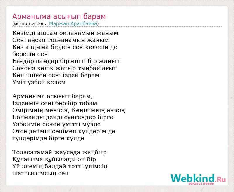 Көзімді ашсам ойланамын жаным Сені аңсап толғанамын жаным Көз алдыма бірден сен келесін де бересін сен Бағдаршамдар бір өшіп бір жанып Сансыз көлік жатыр тыңбай ағып Көп ішінен сені іздей берем Үміт үзбей келем Арманыма асығып барам, Іздеймін сені бәрібір табам Өмірімнің мәнісін, Көңілімнің әнісің Болмайды дейді сүйгендер бірге Үзбеймін сенен үмітті мүлде Өтсе деймін сенімен күндерім де түндерімде бірге күнде Толасатамай жаусада жаңбыр Құлағыма құйылады ән бір Үй әлемің балдай тәтті үнімсің шаттығымсың сен