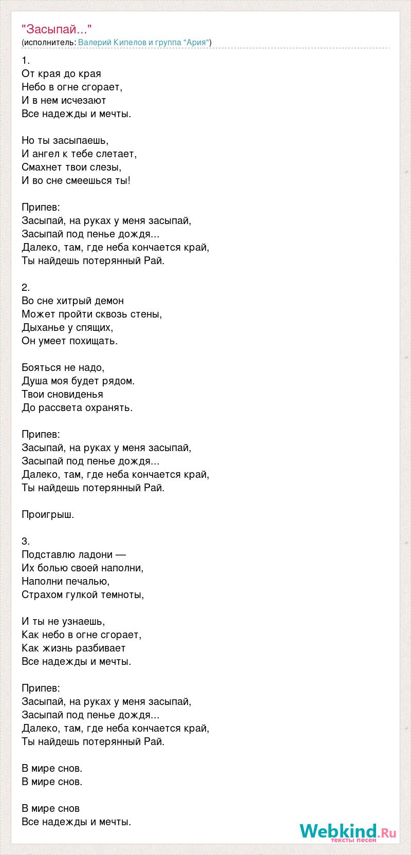 1. От края до края Небо в огне сгорает, И в нем исчезают Все надежды и мечты. Но ты засыпаешь, И ангел к тебе слетает, Смахнет твои слезы, И во сне смеешься ты! Припев: Засыпай, на руках у меня засыпай, Засыпай под пенье дождя... Далеко, там, где неба кончается край, Ты найдешь потерянный Рай. 2. Во сне хитрый демон Может пройти сквозь стены, Дыханье у спящих, Он умеет похищать. Бояться не надо, Душа моя будет рядом. Твои сновиденья До рассвета охранять. Припев: Засыпай, на руках у меня засыпай, Засыпай под пенье дождя... Далеко, там, где неба кончается край, Ты найдешь потерянный Рай. Проигрыш. 3. Подставлю ладони — Их болью своей наполни, Наполни печалью, Страхом гулкой темноты, И ты не узнаешь, Как небо в огне сгорает, Как жизнь разбивает Все надежды и мечты. Припев: Засыпай, на руках у меня засыпай, Засыпай под пенье дождя... Далеко, там, где неба кончается край, Ты найдешь потерянный Рай. В мире снов. В мире снов. В мире снов Все надежды и мечты.