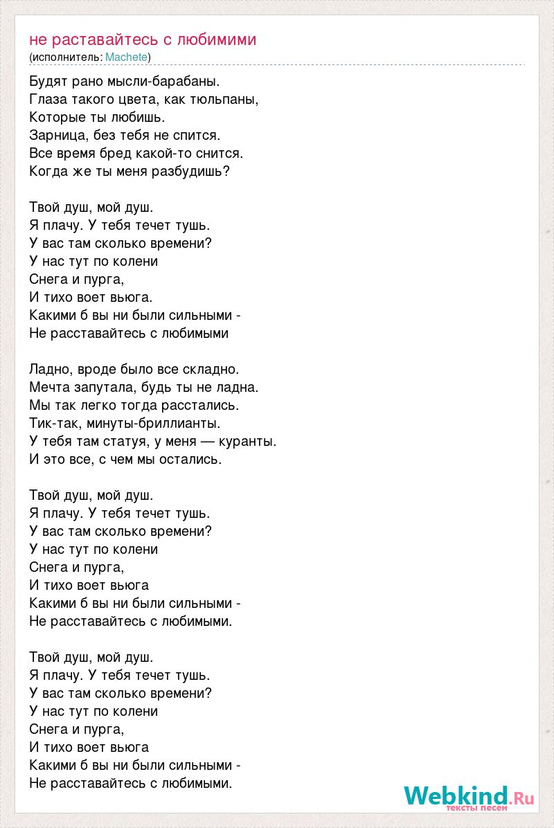 Будят рано мысли-барабаны. Глаза такого цвета, как тюльпаны, Которые ты любишь. Зарница, без тебя не спится. Все время бред какой-то снится. Когда же ты меня разбудишь? Твой душ, мой душ. Я плачу. У тебя течет тушь. У вас там сколько времени? У нас тут по колени Снега и пурга, И тихо воет вьюга. Какими б вы ни были сильными - Не расставайтесь с любимыми Ладно, вроде было все складно. Мечта запутала, будь ты не ладна. Мы так легко тогда расстались. Тик-так, минуты-бриллианты. У тебя там статуя, у меня — куранты. И это все, с чем мы остались. Твой душ, мой душ. Я плачу. У тебя течет тушь. У вас там сколько времени? У нас тут по колени Снега и пурга, И тихо воет вьюга Какими б вы ни были сильными - Не расставайтесь с любимыми. Твой душ, мой душ. Я плачу. У тебя течет тушь. У вас там сколько времени? У нас тут по колени Снега и пурга, И тихо воет вьюга Какими б вы ни были сильными - Не расставайтесь с любимыми.