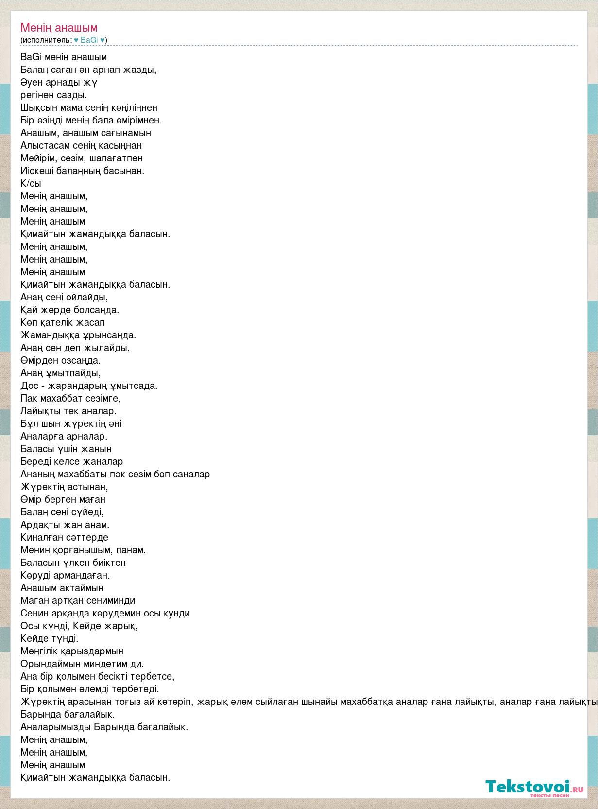 BaGi менің анашым Балаң саған ән арнап жазды, Әуен арнады жү регінен сазды. Шықсын мама сенің көңіліңнен Бір өзіңді менің бала өмірімнен. Анашым, анашым сағынамын Алыстасам сенің қасыңнан Мейірім, сезім, шапағатпен Иіскеші балаңның басынан. К/сы Менің анашым, Менің анашым, Менің анашым Қимайтын жамандыққа баласын. Менің анашым, Менің анашым, Менің анашым Қимайтын жамандыққа баласын. Анаң сені ойлайды, Қай жерде болсаңда. Көп қателік жасап Жамандыққа ұрынсаңда. Анаң сен деп жылайды, Өмірден озсаңда. Анаң ұмытпайды, Дос - жарандарың ұмытсада. Пак махаббат сезімге, Лайықты тек аналар. Бұл шын жүректің әні Аналарға арналар. Баласы үшін жанын Бередi келсе жаналар Ананың махаббаты пәк сезім боп саналар Жүректің астынан, Өмір берген маған Балаң сені сүйеді, Ардақты жан анам. Киналған сәттерде Менин қорғанышым, панам. Баласын үлкен биіктен Көруді армандаған. Анашым актаймын Маган артқан сениминди Сенин арқанда көрудемин осы кунди Осы күнді, Кейде жарық, Кейде түнді. Мәңгілік қарыздармын Орындаймын миндетим ди. Ана бір қолымен бесікті тербетсе, Бір қолымен әлемді тербетеді. Жүректің арасынан тоғыз ай көтеріп, жарық әлем сыйлаған шынайы махаббатқа аналар ғана лайықты, аналар ғана лайықты Барында бағалайык. Аналарымызды Барында бағалайык. Менің анашым, Менің анашым, Менің анашым Қимайтын жамандыққа баласын.