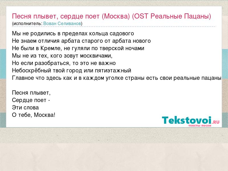 Мы не родились в пределах кольца садового Не знаем отличия арбата старого от арбата нового Не были в Кремле, не гуляли по тверской ночами Мы не из тех, кого зовут москвичами, Но если разобраться, то это не важно Небоскрёбный твой город или пятиэтажный Главное что здесь как и в каждом уголке страны есть свои реальные пацаны Песня плывет, Сердце поет - Эти слова О тебе, Москва!