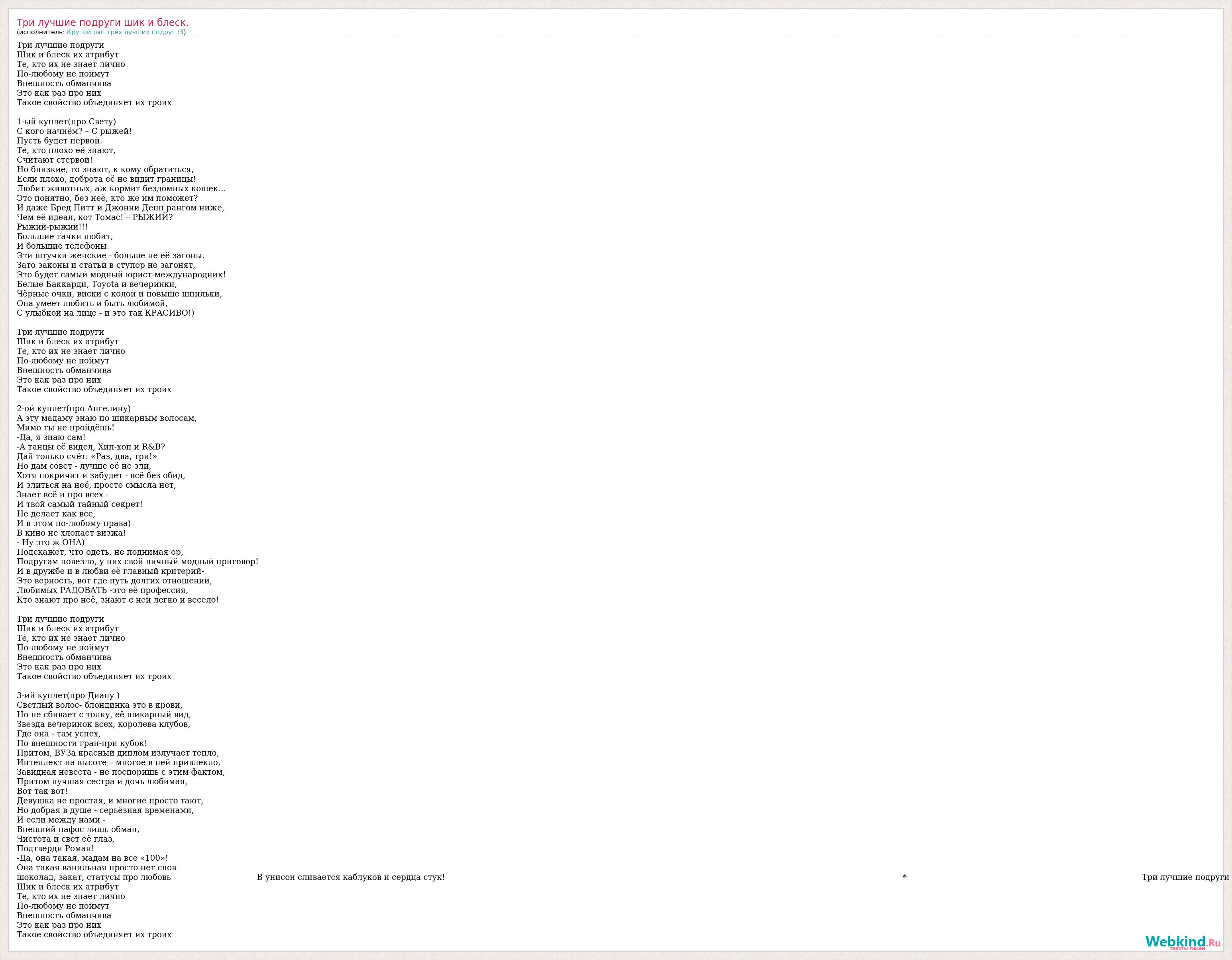 Три лучшие подруги Шик и блеск их атрибут Те, кто их не знает лично По-любому не поймут Внешность обманчива Это как раз про них Такое свойство объединяет их троих 1-ый куплет(про Свету) С кого начнём? – С рыжей! Пусть будет первой. Те, кто плохо её знают, Считают стервой! Но близкие, то знают, к кому обратиться, Если плохо, доброта её не видит границы! Любит животных, аж кормит бездомных кошек… Это понятно, без неё, кто же им поможет? И даже Бред Питт и Джонни Депп рангом ниже, Чем её идеал, кот Томас! – РЫЖИЙ? Рыжий-рыжий!!! Большие тачки любит, И большие телефоны. Эти штучки женские - больше не её загоны. Зато законы и статьи в ступор не загонят, Это будет самый модный юрист-международник! Белые Баккарди, Toyota и вечеринки, Чёрные очки, виски с колой и повыше шпильки, Она умеет любить и быть любимой, С улыбкой на лице - и это так КРАСИВО!) Три лучшие подруги Шик и блеск их атрибут Те, кто их не знает лично По-любому не поймут Внешность обманчива Это как раз про них Такое свойство объединяет их троих 2-ой куплет(про Ангелину) А эту мадаму знаю по шикарным волосам, Мимо ты не пройдёшь! -Да, я знаю сам! -А танцы её видел, Хип-хоп и R&B? Дай только счёт: «Раз, два, три!» Но дам совет - лучше её не зли, Хотя покричит и забудет - всё без обид, И злиться на неё, просто смысла нет, Знает всё и про всех - И твой самый тайный секрет! Не делает как все, И в этом по-любому права) В кино не хлопает визжа! - Ну это ж ОНА) Подскажет, что одеть, не поднимая ор, Подругам повезло, у них свой личный модный приговор! И в дружбе и в любви её главный критерий- Это верность, вот где путь долгих отношений, Любимых РАДОВАТЬ -это её профессия, Кто знают про неё, знают с ней легко и весело! Три лучшие подруги Шик и блеск их атрибут Те, кто их не знает лично По-любому не поймут Внешность обманчива Это как раз про них Такое свойство объединяет их троих 3-ий куплет(про Диану ) Светлый волос- блондинка это в крови, Но не сбивает с толку, её шикарный вид, Звезда вечеринок всех, королева клубов, Где она - там успех, По внешности гран-при кубок! Притом, ВУЗа красный диплом излучает тепло, Интеллект на высоте – многое в ней привлекло, Завидная невеста - не поспоришь с этим фактом, Притом лучшая сестра и дочь любимая, Вот так вот! Девушка не простая, и многие просто тают, Но добрая в душе - серьёзная временами, И если между нами - Внешний пафос лишь обман, Чистота и свет её глаз, Подтверди Роман! -Да, она такая, мадам на все «100»! Она такая ванильная просто нет слов шоколад, закат, статусы про любовь В унисон сливается каблуков и сердца стук! * Три лучшие подруги Шик и блеск их атрибут Те, кто их не знает лично По-любому не поймут Внешность обманчива Это как раз про них Такое свойство объединяет их троих