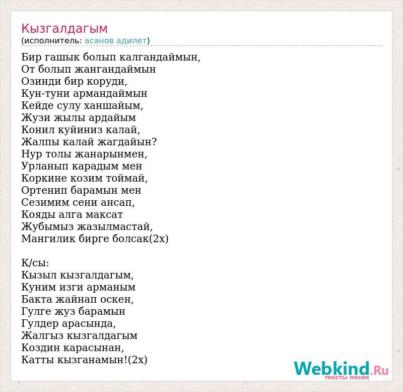 Бир гашык болып калгандаймын, От болып жангандаймын Озинди бир коруди, Кун-туни армандаймын Кейде сулу ханшайым, Жузи жылы ардайым Конил куйиниз калай, Жалпы калай жагдайын? Нур толы жанарынмен, Урланып карадым мен Коркине козим тоймай, Ортенип барамын мен Сезимим сени ансап, Кояды алга максат Жубымыз жазылмастай, Мангилик бирге болсак(2х) К/сы: Кызыл кызгалдагым, Куним изги арманым Бакта жайнап оскен, Гулге жуз барамын Гулдер арасында, Жалгыз кызгалдагым Коздин карасынан, Катты кызганамын!(2х)