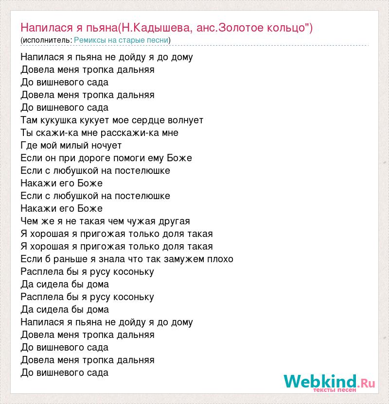 Напилася я пьяна не дойду я до дому Довела меня тропка дальняя До вишневого сада Довела меня тропка дальняя До вишневого сада Там кукушка кукует мое сердце волнует Ты скажи-ка мне расскажи-ка мне Где мой милый ночует Если он при дороге помоги ему Боже Если с любушкой на постелюшке Накажи его Боже Если с любушкой на постелюшке Накажи его Боже Чем же я не такая чем чужая другая Я хорошая я пригожая только доля такая Я хорошая я пригожая только доля такая Если б раньше я знала что так замужем плохо Расплела бы я русу косоньку Да сидела бы дома Расплела бы я русу косоньку Да сидела бы дома Напилася я пьяна не дойду я до дому Довела меня тропка дальняя До вишневого сада Довела меня тропка дальняя До вишневого сада