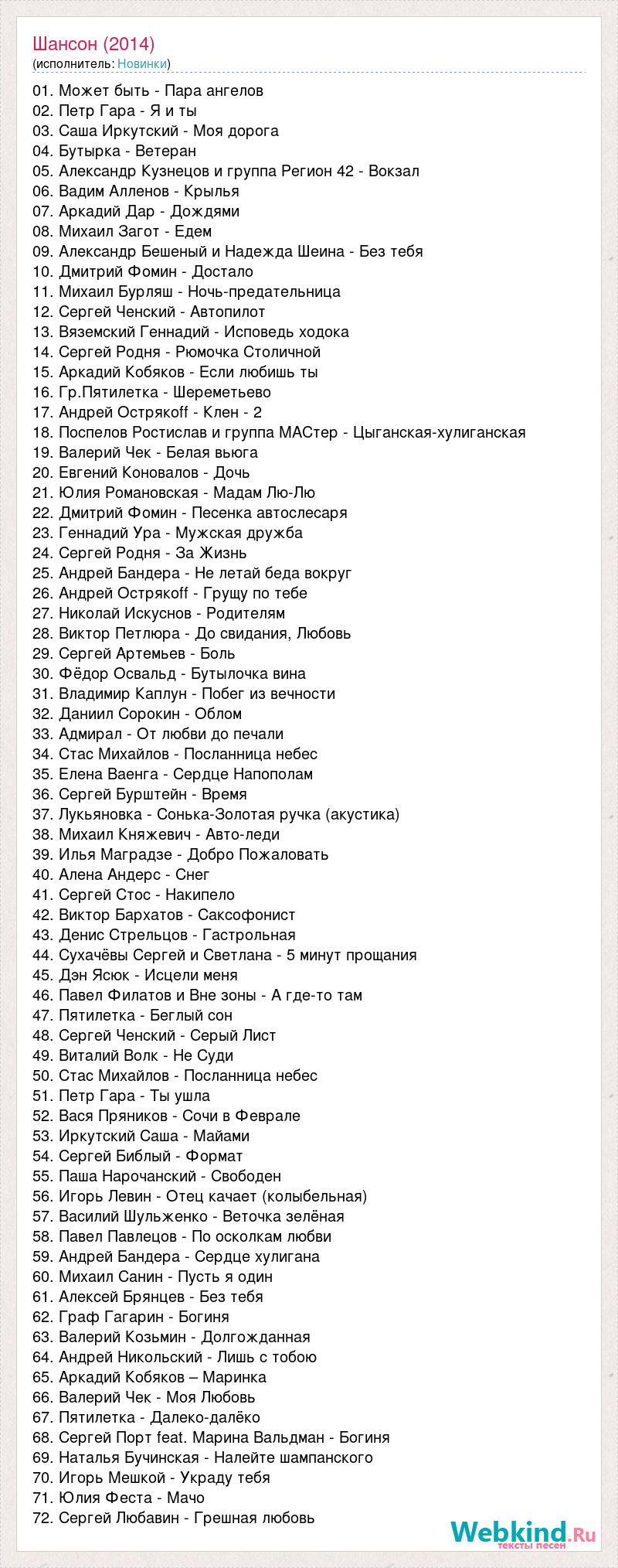 01. Может быть - Пара ангелов 02. Петр Гара - Я и ты 03. Саша Иркутский - Моя дорога 04. Бутырка - Ветеран 05. Александр Кузнецов и группа Регион 42 - Вокзал 06. Вадим Алленов - Крылья 07. Аркадий Дар - Дождями 08. Михаил Загот - Едем 09. Александр Бешеный и Надежда Шеина - Без тебя 10. Дмитрий Фомин - Достало 11. Михаил Бурляш - Ночь-предательница 12. Сергей Ченский - Автопилот 13. Вяземский Геннадий - Исповедь ходока 14. Сергей Родня - Рюмочка Столичной 15. Аркадий Кобяков - Если любишь ты 16. Гр.Пятилетка - Шереметьево 17. Андрей Острякоff - Клен - 2 18. Поспелов Ростислав и группа МАСтер - Цыганская-хулиганская 19. Валерий Чек - Белая вьюга 20. Евгений Коновалов - Дочь 21. Юлия Романовская - Мадам Лю-Лю 22. Дмитрий Фомин - Песенка автослесаря 23. Геннадий Ура - Мужская дружба 24. Сергей Родня - За Жизнь 25. Андрей Бандера - Не летай беда вокруг 26. Андрей Острякоff - Грущу по тебе 27. Николай Искуснов - Родителям 28. Виктор Петлюра - До свидания, Любовь 29. Сергей Артемьев - Боль 30. Фёдор Освальд - Бутылочка вина 31. Владимир Каплун - Побег из вечности 32. Даниил Сорокин - Облом 33. Адмирал - От любви до печали 34. Стас Михайлов - Посланница небес 35. Елена Ваенга - Сердце Напополам 36. Сергей Бурштейн - Время 37. Лукьяновка - Сонька-Золотая ручка (акустика) 38. Михаил Княжевич - Авто-леди 39. Илья Маградзе - Добро Пожаловать 40. Алена Андерс - Снег 41. Сергей Стос - Накипело 42. Виктор Бархатов - Саксофонист 43. Денис Стрельцов - Гастрольная 44. Сухачёвы Сергей и Светлана - 5 минут прощания 45. Дэн Ясюк - Исцели меня 46. Павел Филатов и Вне зоны - А где-то там 47. Пятилетка - Беглый сон 48. Сергей Ченский - Серый Лист 49. Виталий Волк - Не Cуди 50. Стас Михайлов - Посланница небес 51. Петр Гара - Ты ушла 52. Вася Пряников - Сочи в Феврале 53. Иркутский Саша - Майами 54. Сергей Библый - Формат 55. Паша Нарочанский - Свободен 56. Игорь Левин - Отец качает (колыбельная) 57. Василий Шульженко - Веточка зелёная 58. Павел Павлецов - По осколкам любви 59. Андрей Бандера - Сердце хулигана 60. Михаил Санин - Пусть я один 61. Алексей Брянцев - Без тебя 62. Граф Гагарин - Богиня 63. Валерий Козьмин - Долгожданная 64. Андрей Никольский - Лишь с тобою 65. Аркадий Кобяков – Маринка 66. Валерий Чек - Моя Любовь 67. Пятилетка - Далеко-далёко 68. Сергей Порт feat. Марина Вальдман - Богиня 69. Наталья Бучинская - Налейте шампанского 70. Игорь Мешкой - Украду тебя 71. Юлия Феста - Мачо 72. Сергей Любавин - Грешная любовь