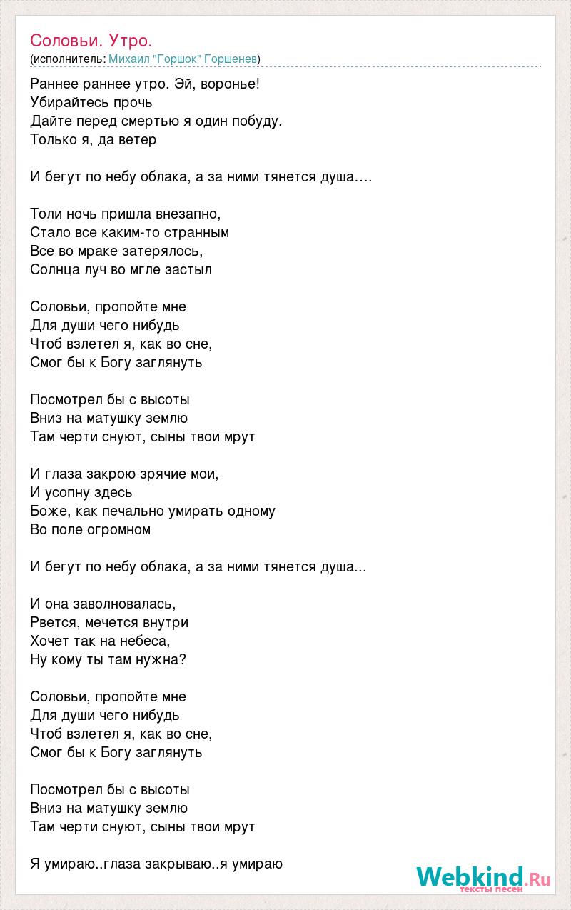 Раннее раннее утро. Эй, воронье! Убирайтесь прочь Дайте перед смертью я один побуду. Только я, да ветер И бегут по небу облака, а за ними тянется душа…. Толи ночь пришла внезапно, Стало все каким-то странным Все во мраке затерялось, Cолнца луч во мгле застыл Соловьи, пропойте мне Для души чего нибудь Чтоб взлетел я, как во сне, Смог бы к Богу заглянуть Посмотрел бы с высоты Вниз на матушку землю Там черти снуют, сыны твои мрут И глаза закрою зрячие мои, И усопну здесь Боже, как печально умирать одному Во поле огромном И бегут по небу облака, а за ними тянется душа... И она заволновалась, Рвется, мечется внутри Хочет так на небеса, Ну кому ты там нужна? Соловьи, пропойте мне Для души чего нибудь Чтоб взлетел я, как во сне, Смог бы к Богу заглянуть Посмотрел бы с высоты Вниз на матушку землю Там черти снуют, сыны твои мрут Я умираю..глаза закрываю..я умираю