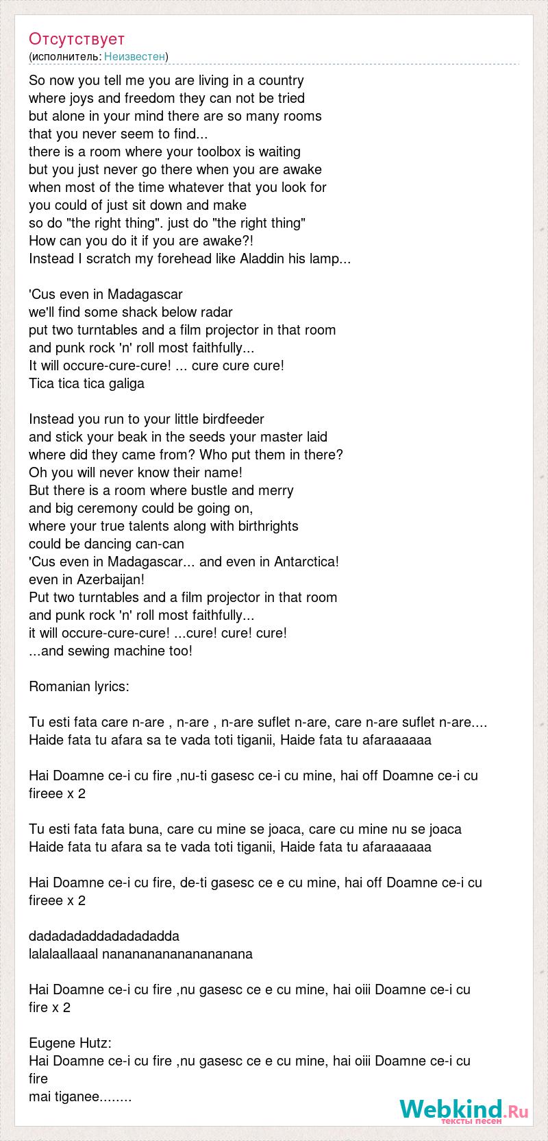 So now you tell me you are living in a country where joys and freedom they can not be tried but alone in your mind there are so many rooms that you never seem to find... there is a room where your toolbox is waiting but you just never go there when you are awake when most of the time whatever that you look for you could of just sit down and make so do "the right thing". just do "the right thing" How can you do it if you are awake?! Instead I scratch my forehead like Aladdin his lamp... 'Cus even in Madagascar we'll find some shack below radar put two turntables and a film projector in that room and punk rock 'n' roll most faithfully... It will occure-cure-cure! ... cure cure cure! Tica tica tica galiga Instead you run to your little birdfeeder and stick your beak in the seeds your master laid where did they came from? Who put them in there? Oh you will never know their name! But there is a room where bustle and merry and big ceremony could be going on, where your true talents along with birthrights could be dancing can-can 'Cus even in Madagascar... and even in Antarctica! even in Azerbaijan! Put two turntables and a film projector in that room and punk rock 'n' roll most faithfully... it will occure-cure-cure! ...cure! cure! cure! ...and sewing machine too! Romanian lyrics: Tu esti fata care n-are , n-are , n-are suflet n-are, care n-are suflet n-are.... Haide fata tu afara sa te vada toti tiganii, Haide fata tu afaraaaaaa Hai Doamne ce-i cu fire ,nu-ti gasesc ce-i cu mine, hai off Doamne ce-i cu fireee x 2 Tu esti fata fata buna, care cu mine se joaca, care cu mine nu se joaca Haide fata tu afara sa te vada toti tiganii, Haide fata tu afaraaaaaa Hai Doamne ce-i cu fire, de-ti gasesc ce e cu mine, hai off Doamne ce-i cu fireee x 2 dadadadaddadadadadda lalalaallaaal nananananananananana Hai Doamne ce-i cu fire ,nu gasesc ce e cu mine, hai oiii Doamne ce-i cu fire x 2 Eugene Hutz: Hai Doamne ce-i cu fire ,nu gasesc ce e cu mine, hai oiii Doamne ce-i cu fire mai tiganee........