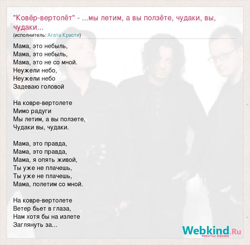 Мама, это небыль, Мама, это небыль, Мама, это не со мной. Неужели небо, Неужели небо Задеваю головой На ковре-вертолете Мимо радуги Мы летим, а вы ползете, Чудаки вы, чудаки. Мама, это правда, Мама, это правда, Мама, я опять живой, Ты уже не плачешь, Ты уже не плачешь, Мама, полетим со мной. На ковре-вертолете Ветер бьет в глаза, Нам хотя бы на излете Заглянуть за...