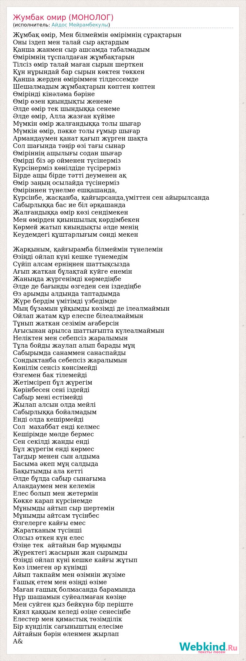 Жұмбақ өмір, Мен білмеймін өмірімнің сұрақтарын Оны іздеп мен талай сыр ақтардым Қанша жанмен сыр ашсамда табалмадым Өмірімнің тұспалдаған жұмбақтарын Тілсіз өмір талай маған сырын шерткен Құн нұрындай бар сырын көктен төккен Қанша жерден өміріммен тілдессемде Шешалмадым жұмбақтарын көптен көптен Өмірінді кінәләма бәріне Өмір өзен қиындықты женеме Әлде өмір тек шындыққа сенеме Әлде өмір, Алла жазған күйіме Мүмкін өмір жалғандыққа толы шығар Мүмкін өмір, пәкке толы ғұмыр шығар Армандаумен қанат қағып жүрген шақта Сол шағында тәңір өзі тағы сынар Өміріннің ащылығы содан шығар Өмірді біз әр ойменен түсінерміз Күрсінерміз көнілдіде түсірерміз Бірде ащы бірде тәтті деуменен ақ Өмір заңың осылайда түсінерміз Өміріннен түнелме ешқашанда, Күрсінбе, жасқанба, қайғырсанда,үміттен сен айырылсанда Сабырлыққа бас ие біл әрқашанда Жалғандыққа өмір көзі сендімекен Мен өмірден қиыншылық көрдімбекен Көрмей жатып киындықты әлде менің Кеудемдегі құштарлығым сөнді мекен Жарқыным, қайғырамба білмеймін түнелемін Өзіңді ойлап күні кешке түнемедім Сүйіп алсам ерніңнен шаттықсызда Ағып жаткан бұлақтай куйге енемін Жаныңда жүргенімді көрмедіңбе Әлде де бағынды өзгеден сен іздедіңбе Өз арымды алдында таптадымда Жүре бердім үмітімді үзбедімде Мың бұзамын ұйқымды көзімді де ілеалмаймын Ойлап жатам құр елеспе білеалмаймын Тұнып жаткан сезімім ағаберсін Ағысынан арылса шаттығыпта күлеалмаймын Неліктен мен себепсіз жаралымын Тұла бойды жаулап алып барады мұң Сабырымда санаммен санаспайды Сондыктанба себепсіз жаралымын Көнілім сенсіз көнсімейді Өзгемен бак тілемейді Жетімсіреп бұл жүрегім Көрінбесен сені іздейді Сабыр мені естімейді Жылап алсын олда мейлі Сабырлыққа бойалмадым Енді олда кешірмейді Сол махаббат енді келмес Кешірімде мөлде бермес Сен секілді жанды енді Бұл жүрегім енді көрмес Тағдыр менен сын алдыма Басыма әкеп мұң салдыда Бақытымды ала кетті Әлде бұлда сабыр сынағыма Аландаумен мен келемін Елес болып мен жетермін Көкке карап күрсінемде Мұнымды айтып сыр шертемін Мұнымды айтсам түсінбес Өзгелерге кайғы емес Жаратканым түсінші Олсыз өткен күн елес Өзіңе тек айтайын бар мұңымды Жүректегі жасырын жан сырымды Өзіңді ойлап күні кешке кайғы жұтып Көз ілмеген әр күнімді Айып такпайм мен өзімнін жүзіме Ғашық етем мен өзіңді өзіме Маған ғашық болмасанда барамында Нұр шашамын суйеалмаған көзіңе Мен суйген қыз бейкүнә бір періште Қиял қаққым келеді өзіңе сенесіңбе Елестер мен қимастық төзімділік Бір күнділік сағыныштың елесіме Айтайын бәрін өленмен жырлап А&