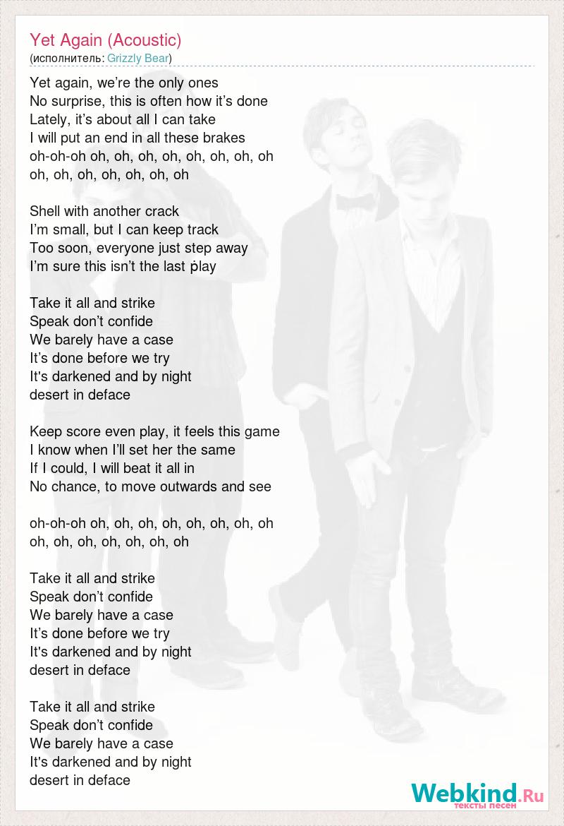 Yet again, we’re the only ones No surprise, this is often how it’s done Lately, it’s about all I can take I will put an end in all these brakes oh-oh-oh oh, oh, oh, oh, oh, oh, oh, oh oh, oh, oh, oh, oh, oh, oh Shell with another crack I’m small, but I can keep track Too soon, everyone just step away I’m sure this isn’t the last ṗlay Take it all and strike Speak don’t confide We barely have a case It’s done before we try It's darkened and by night desert in deface Keep score even play, it feels this game I know when I’ll set her the same If I could, I will beat it all in No chance, to move outwards and see oh-oh-oh oh, oh, oh, oh, oh, oh, oh, oh oh, oh, oh, oh, oh, oh, oh Take it all and strike Speak don’t confide We barely have a case It’s done before we try It's darkened and by night desert in deface Take it all and strike Speak don’t confide We barely have a case It's darkened and by night desert in deface