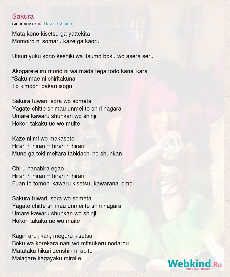 Mata kono kisetsu ga yattekita Momoiro ni somaru kaze ga kaoru Utsuri yuku kono keshiki wa itsumo boku wo asera seru Akogarete iru mono ni wa mada tega todo kanai kara "Saku mae ni chiritakunai" To kimochi bakari isogu Sakura fuwari, sora wo someta Yagate chitte shimau unmei to shiri nagara Umare kawaru shunkan wo shinji Hokori takaku ue wo muite Kaze ni mi wo makasete Hirari ~ hirari ~ hirari ~ hirari Mune ga toki meitara tabidachi no shunkan Chiru hanabira egao Hirari ~ hirari ~ hirari ~ hirari Fuan to tomoni kawaru kisetsu, kawaranai omoi Sakura fuwari, sora wo someta Yagate chitte shimau unmei to shiri nagara Umare kawaru shunkan wo shinji Hokori takaku ue wo muite Kagiri aru jikan, meguru kisetsu Boku wa korekara nani wo mitsukeru nodarou Matataku hikari zenshin ni abite Maiagare kagayaku mirai e