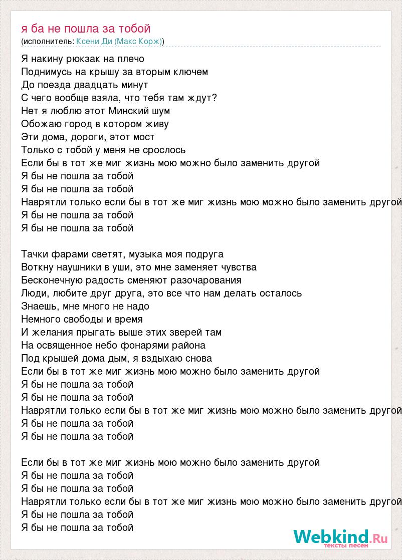 Я накину рюкзак на плечо Поднимусь на крышу за вторым ключем До поезда двадцать минут С чего вообще взяла, что тебя там ждут? Нет я люблю этот Минский шум Обожаю город в котором живу Эти дома, дороги, этот мост Только с тобой у меня не срослось Если бы в тот же миг жизнь мою можно было заменить другой Я бы не пошла за тобой Я бы не пошла за тобой Наврятли только если бы в тот же миг жизнь мою можно было заменить другой Я бы не пошла за тобой Я бы не пошла за тобой Тачки фарами светят, музыка моя подруга Воткну наушники в уши, это мне заменяет чувства Бесконечную радость сменяют разочарования Люди, любите друг друга, это все что нам делать осталось Знаешь, мне много не надо Немного свободы и время И желания прыгать выше этих зверей там На освященное небо фонарями района Под крышей дома дым, я вздыхаю снова Если бы в тот же миг жизнь мою можно было заменить другой Я бы не пошла за тобой Я бы не пошла за тобой Наврятли только если бы в тот же миг жизнь мою можно было заменить другой Я бы не пошла за тобой Я бы не пошла за тобой Если бы в тот же миг жизнь мою можно было заменить другой Я бы не пошла за тобой Я бы не пошла за тобой Наврятли только если бы в тот же миг жизнь мою можно было заменить другой Я бы не пошла за тобой Я бы не пошла за тобой
