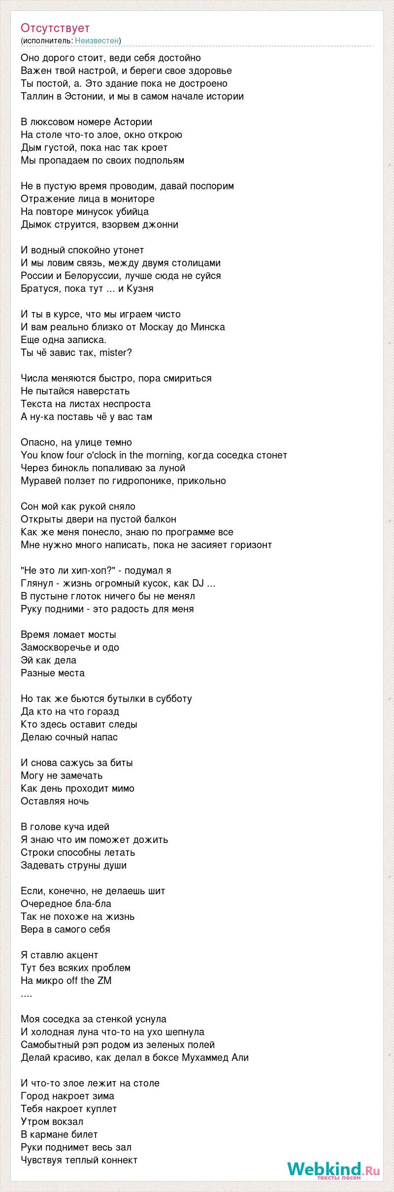 Оно дорого стоит, веди себя достойно Важен твой настрой, и береги свое здоровье Ты постой, а. Это здание пока не достроено Таллин в Эстонии, и мы в самом начале истории В люксовом номере Астории На столе что-то злое, окно открою Дым густой, пока нас так кроет Мы пропадаем по своих подпольям Не в пустую время проводим, давай поспорим Отражение лица в мониторе На повторе минусок убийца Дымок струится, взорвем джонни И водный спокойно утонет И мы ловим связь, между двумя столицами России и Белоруссии, лучше сюда не суйся Братуся, пока тут ... и Кузня И ты в курсе, что мы играем чисто И вам реально близко от Москау до Минска Еще одна записка. Ты чё завис так, mister? Числа меняются быстро, пора смириться Не пытайся наверстать Текста на листах неспроста А ну-ка поставь чё у вас там Опасно, на улице темно You know four o'clock in the morning, когда соседка стонет Через бинокль попаливаю за луной Муравей ползет по гидропонике, прикольно Сон мой как рукой сняло Открыты двери на пустой балкон Как же меня понесло, знаю по программе все Мне нужно много написать, пока не засияет горизонт "Не это ли хип-хоп?" - подумал я Глянул - жизнь огромный кусок, как DJ ... В пустыне глоток ничего бы не менял Руку подними - это радость для меня Время ломает мосты Замоскворечье и одо Эй как дела Разные места Но так же бьются бутылки в субботу Да кто на что горазд Кто здесь оставит следы Делаю сочный напас И снова сажусь за биты Могу не замечать Как день проходит мимо Оставляя ночь В голове куча идей Я знаю что им поможет дожить Строки способны летать Задевать струны души Если, конечно, не делаешь шит Очередное бла-бла Так не похоже на жизнь Вера в самого себя Я ставлю акцент Тут без всяких проблем На микро off the ZM .... Моя соседка за стенкой уснула И холодная луна что-то на ухо шепнула Самобытный рэп родом из зеленых полей Делай красиво, как делал в боксе Мухаммед Али И что-то злое лежит на столе Город накроет зима Тебя накроет куплет Утром вокзал В кармане билет Руки поднимет весь зал Чувствуя теплый коннект