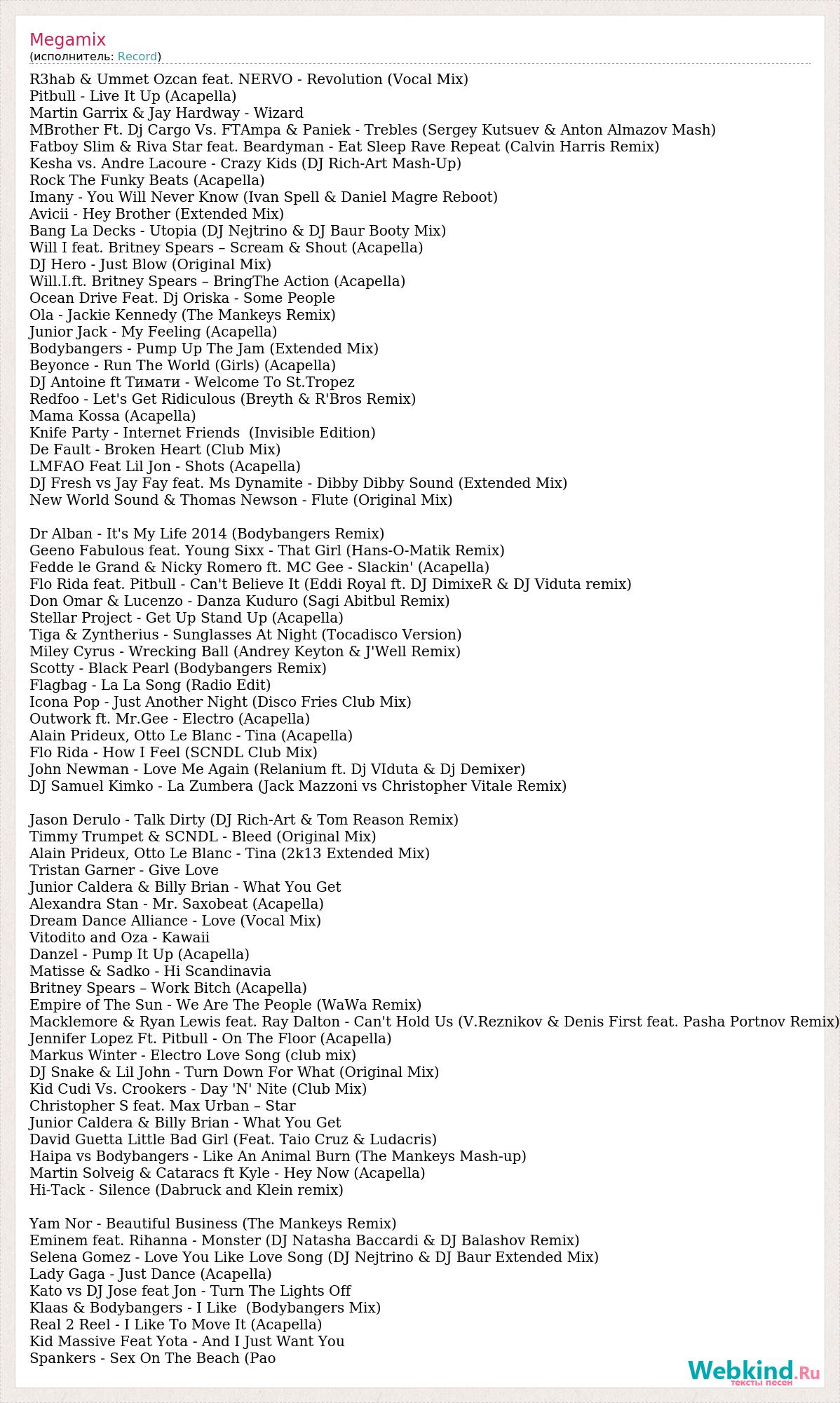 R3hab & Ummet Ozcan feat. NERVO - Revolution (Vocal Mix) Pitbull - Live It Up (Acapella) Martin Garrix & Jay Hardway - Wizard MBrother Ft. Dj Cargo Vs. FTAmpa & Paniek - Trebles (Sergey Kutsuev & Anton Almazov Mash) Fatboy Slim & Riva Star feat. Beardyman - Eat Sleep Rave Repeat (Calvin Harris Remix) Kesha vs. Andre Lacoure - Crazy Kids (DJ Rich-Art Mash-Up) Rock The Funky Beats (Acapella) Imany - You Will Never Know (Ivan Spell & Daniel Magre Reboot) Avicii - Hey Brother (Extended Mix) Bang La Decks - Utopia (DJ Nejtrino & DJ Baur Booty Mix) Will I feat. Britney Spears – Scream & Shout (Acapella) DJ Hero - Just Blow (Original Mix) Will.I.ft. Britney Spears – BringThe Action (Acapella) Ocean Drive Feat. Dj Oriska - Some People Ola - Jackie Kennedy (The Mankeys Remix) Junior Jack - My Feeling (Acapella) Bodybangers - Pump Up The Jam (Extended Mix) Beyonce - Run The World (Girls) (Acapella) DJ Antoine ft Тимати - Welcome To St.Tropez Redfoo - Let's Get Ridiculous (Breyth & R'Bros Remix) Mama Kossa (Acapella) Knife Party - Internet Friends (Invisible Edition) De Fault - Broken Heart (Club Mix) LMFAO Feat Lil Jon - Shots (Acapella) DJ Fresh vs Jay Fay feat. Ms Dynamite - Dibby Dibby Sound (Extended Mix) New World Sound & Thomas Newson - Flute (Original Mix) Dr Alban - It's My Life 2014 (Bodybangers Remix) Geeno Fabulous feat. Young Sixx - That Girl (Hans-O-Matik Remix) Fedde le Grand & Nicky Romero ft. MC Gee - Slackin' (Acapella) Flo Rida feat. Pitbull - Can't Believe It (Eddi Royal ft. DJ DimixeR & DJ Viduta remix) Don Omar & Lucenzo - Danza Kuduro (Sagi Abitbul Remix) Stellar Project - Get Up Stand Up (Acapella) Tiga & Zyntherius - Sunglasses At Night (Tocadisco Version) Miley Cyrus - Wrecking Ball (Andrey Keyton & J'Well Remix) Scotty - Black Pearl (Bodybangers Remix) Flagbag - La La Song (Radio Edit) Icona Pop - Just Another Night (Disco Fries Club Mix) Outwork ft. Mr.Gee - Electro (Acapella) Alain Prideux, Otto Le Blanc - Tina (Acapella) Flo Rida - How I Feel (SCNDL Club Mix) John Newman - Love Me Again (Relanium ft. Dj VIduta & Dj Demixer) DJ Samuel Kimko - La Zumbera (Jack Mazzoni vs Christopher Vitale Remix) Jason Derulo - Talk Dirty (DJ Rich-Art & Tom Reason Remix) Timmy Trumpet & SCNDL - Bleed (Original Mix) Alain Prideux, Otto Le Blanc - Tina (2k13 Extended Mix) Tristan Garner - Give Love Junior Caldera & Billy Brian - What You Get Alexandra Stan - Mr. Saxobeat (Acapella) Dream Dance Alliance - Love (Vocal Mix) Vitodito and Oza - Kawaii Danzel - Pump It Up (Acapella) Matisse & Sadko - Hi Scandinavia Britney Spears – Work Bitch (Acapella) Empire of The Sun - We Are The People (WaWa Remix) Macklemore & Ryan Lewis feat. Ray Dalton - Can't Hold Us (V.Reznikov & Denis First feat. Pasha Portnov Remix) Jennifer Lopez Ft. Pitbull - On The Floor (Acapella) Markus Winter - Electro Love Song (club mix) DJ Snake & Lil John - Turn Down For What (Original Mix) Kid Cudi Vs. Crookers - Day 'N' Nite (Club Mix) Christopher S feat. Max Urban – Star Junior Caldera & Billy Brian - What You Get David Guetta Little Bad Girl (Feat. Taio Cruz & Ludacris) Haipa vs Bodybangers - Like An Animal Burn (The Mankeys Mash-up) Martin Solveig & Cataracs ft Kyle - Hey Now (Acapella) Hi-Tack - Silence (Dabruck and Klein remix) Yam Nor - Beautiful Business (The Mankeys Remix) Eminem feat. Rihanna - Monster (DJ Natasha Baccardi & DJ Balashov Remix) Selena Gomez - Love You Like Love Song (DJ Nejtrino & DJ Baur Extended Mix) Lady Gaga - Just Dance (Acapella) Kato vs DJ Jose feat Jon - Turn The Lights Off Klaas & Bodybangers - I Like (Bodybangers Mix) Real 2 Reel - I Like To Move It (Acapella) Kid Massive Feat Yota - And I Just Want You Spankers - Sex On The Beach (Pao