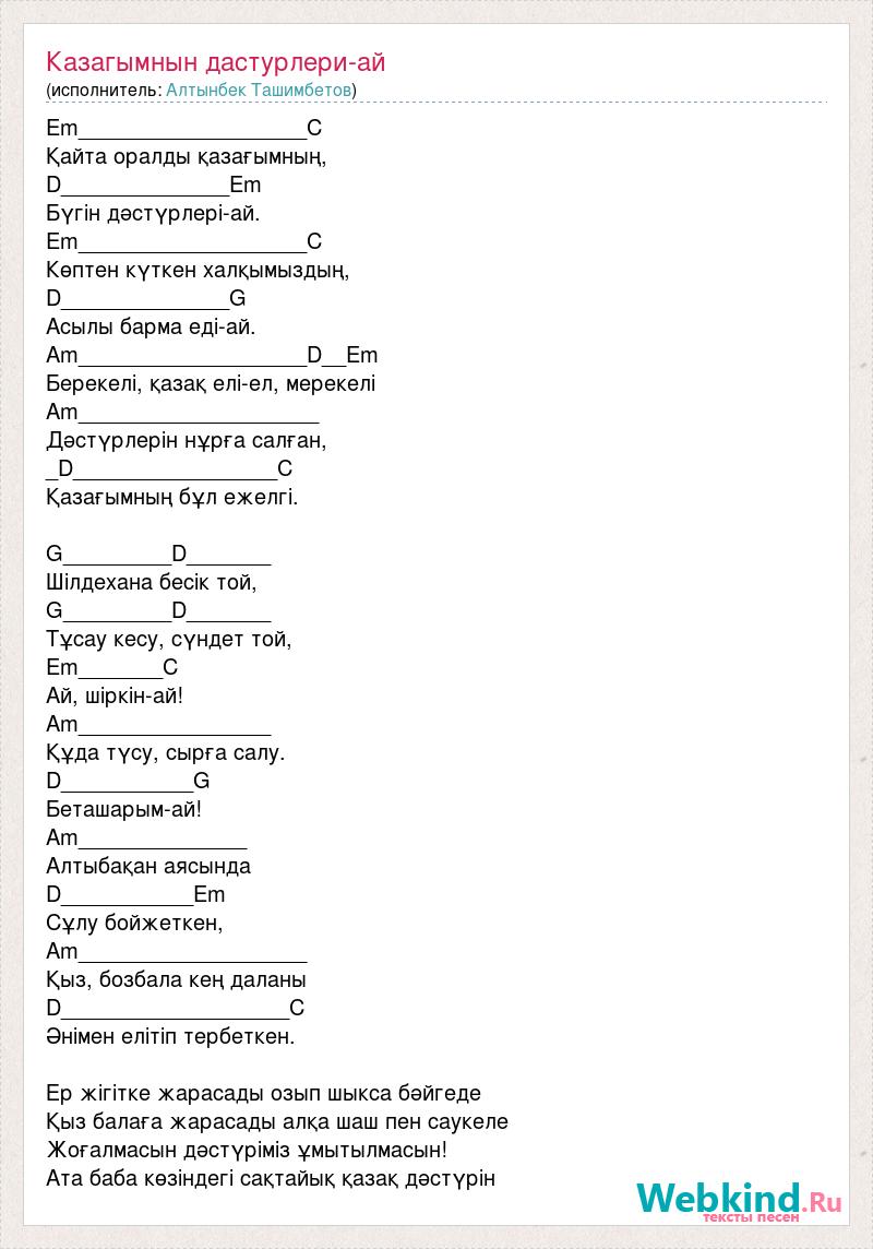 Em___________________C Қайта оралды қазағымның, D______________Em Бүгін дәстүрлері-ай. Em___________________C Көптен күткен халқымыздың, D______________G Асылы барма еді-ай. Am___________________D__Em Берекелі, қазақ елі-ел, мерекелі Am____________________ Дәстүрлерін нұрға салған, _D_________________C Қазағымның бұл ежелгі. G_________D_______ Шілдехана бесік той, G_________D_______ Тұсау кесу, сүндет той, Em_______C Ай, шіркін-ай! Am________________ Құда түсу, сырға салу. D___________G Беташарым-ай! Am______________ Алтыбақан аясында D___________Em Сұлу бойжеткен, Am___________________ Қыз, бозбала кең даланы D___________________C Әнімен елітіп тербеткен. Ер жігітке жарасады озып шыкса бәйгеде Қыз балаға жарасады алқа шаш пен саукеле Жоғалмасын дәстүріміз ұмытылмасын! Ата баба көзіндегі сақтайық қазақ дәстүрін