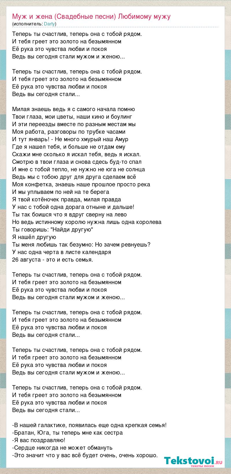 Теперь ты счастлив, теперь она с тобой рядом. И тебя греет это золото на безымянном Её рука это чувства любви и покоя Ведь вы сегодня стали мужом и женою... Теперь ты счастлив, теперь она с тобой рядом. И тебя греет это золото на безымянном Её рука это чувства любви и покоя Ведь вы сегодня стали... Милая знаешь ведь я с самого начала помню Твои глаза, мои цветы, наши кино и боулинг И эти переезды вместе по разным местам мы Моя работа, разговоры по трубке часами И тут январь! - Не много хмурый наш Амур Где я нашел тебя, и больше не отдам ему Скажи мне сколько я искал тебя, ведь я искал. Смотрю в твои глаза и снова сдесь буд-то спал И мне с тобой тепло, не нужно не юга не солнца Ведь мы с тобою друг для друга сделаем всё Моя конфетка, знаешь наше прошлое просто река И мы уплываем по ней на те берега Я твой котёночек правда, милая правда У нас с тобой одна дорага отныне и дальше! Ты так боишся что я вдруг сверну на лево Но ведь истинному королю нужна лишь одна королева Ты говоришь: "Найди другую" Я нашёл другую Ты меня любишь так безумно: Но зачем ревнуешь? У нас одна черта в листе календаря 26 августа - это и есть семья. Теперь ты счастлив, теперь она с тобой рядом. И тебя греет это золото на безымянном Её рука это чувства любви и покоя Ведь вы сегодня стали мужом и женою... Теперь ты счастлив, теперь она с тобой рядом. И тебя греет это золото на безымянном Её рука это чувства любви и покоя Ведь вы сегодня стали... Теперь ты счастлив, теперь она с тобой рядом. И тебя греет это золото на безымянном Её рука это чувства любви и покоя Ведь вы сегодня стали мужом и женою... Теперь ты счастлив, теперь она с тобой рядом. И тебя греет это золото на безымянном Её рука это чувства любви и покоя Ведь вы сегодня стали... -В нашей галактике, появилась еще одна крепкая семья! -Братан, Юга, ты теперь мне как сестра -Я вас поздравляю! -Сердце никогда не может обмануть -Это значит что у вас всё будет очень, очень хорошо.