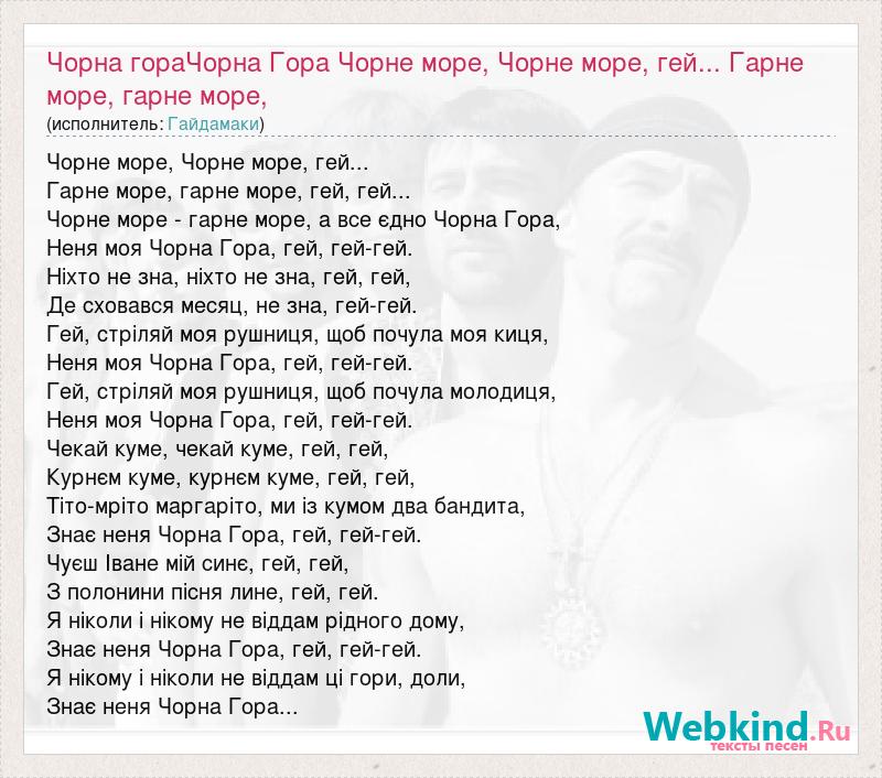 Чорне море, Чорне море, гей... Гарне море, гарне море, гей, гей... Чорне море - гарне море, а все єдно Чорна Гора, Неня моя Чорна Гора, гей, гей-гей. Ніхто не зна, ніхто не зна, гей, гей, Де сховався месяц, не зна, гей-гей. Гей, стріляй моя рушниця, щоб почула моя киця, Неня моя Чорна Гора, гей, гей-гей. Гей, стріляй моя рушниця, щоб почула молодиця, Неня моя Чорна Гора, гей, гей-гей. Чекай куме, чекай куме, гей, гей, Курнєм куме, курнєм куме, гей, гей, Тіто-мріто маргаріто, ми із кумом два бандита, Знає неня Чорна Гора, гей, гей-гей. Чуєш Іване мій синє, гей, гей, З полонини пісня лине, гей, гей. Я ніколи і нікому не віддам рідного дому, Знає неня Чорна Гора, гей, гей-гей. Я нікому і ніколи не віддам ці гори, доли, Знає неня Чорна Гора...