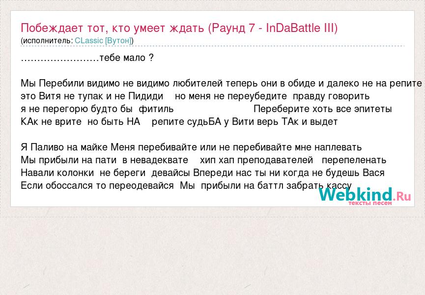 ……………………тебе мало ? Мы Перебили видимо не видимо любителей теперь они в обиде и далеко не на репите это Витя не тупак и не Пидиди но меня не переубедите правду говорить я не перегорю будто бы фитиль Переберите хоть все эпитеты КАк не врите но быть НА репите судьБА у Вити верь ТАк и выдет Я Паливо на майке Меня перебивайте или не перебивайте мне наплевать Мы прибыли на пати в невадеквате хип хап преподавателей перепеленать Навали колонки не береги девайсы Впереди нас ты ни когда не будешь Вася Если обоссался то переодевайся Мы прибыли на баттл забрать кассу