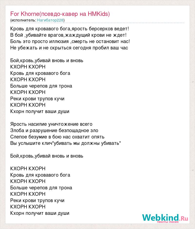 Кровь для кровавого бога,ярость берсерков ведет! В бой ,убивайте врагов,жаждущий крови не ждет! Боль это просто иллюзия ,смерть не остановит нас! Не убежать и не скрыться сегодня пробил ваш час Бой,кровь,убивай вновь и вновь КХОРН КХОРН Кровь для кровавого бога КХОРН КХОРН Больше черепов для трона КХОРН КХОРН Реки крови трупов кучи КХОРН КХОРН Кхорн получит ваши души Ярость насилие уничтожение всего Злоба и разрушение безпощадное зло Слепое безумие в бою нас охватит опять Вы услышите клич"убивать мы должны убивать" Бой,кровь,убивай вновь и вновь КХОРН КХОРН Кровь для кровавого бога КХОРН КХОРН Больше черепов для трона КХОРН КХОРН Реки крови трупов кучи КХОРН КХОРН Кхорн получит ваши души