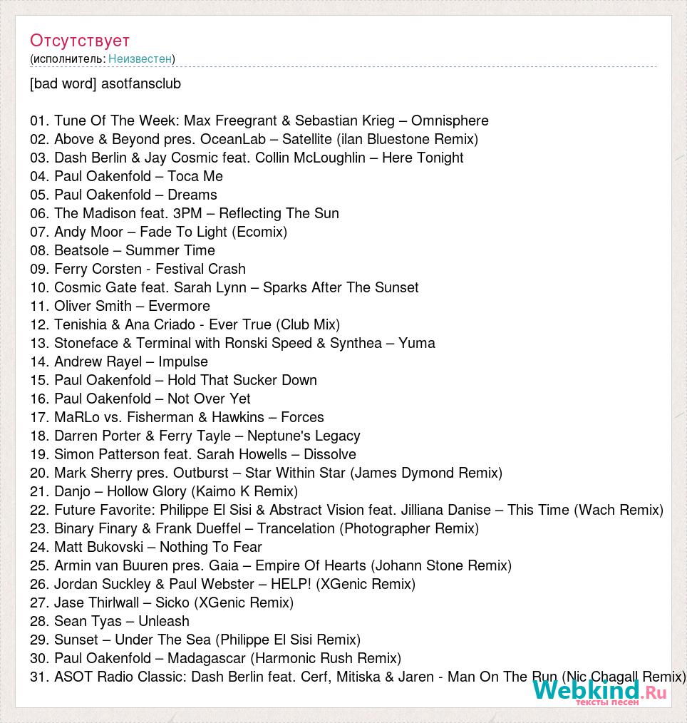 [bad word] asotfansclub 01. Tune Of The Week: Max Freegrant & Sebastian Krieg – Omnisphere 02. Above & Beyond pres. OceanLab – Satellite (ilan Bluestone Remix) 03. Dash Berlin & Jay Cosmic feat. Collin McLoughlin – Here Tonight 04. Paul Oakenfold – Toca Me 05. Paul Oakenfold – Dreams 06. The Madison feat. 3PM – Reflecting The Sun 07. Andy Moor – Fade To Light (Ecomix) 08. Beatsole – Summer Time 09. Ferry Corsten - Festival Crash 10. Cosmic Gate feat. Sarah Lynn – Sparks After The Sunset 11. Oliver Smith – Evermore 12. Tenishia & Ana Criado - Ever True (Club Mix) 13. Stoneface & Terminal with Ronski Speed & Synthea – Yuma 14. Andrew Rayel – Impulse 15. Paul Oakenfold – Hold That Sucker Down 16. Paul Oakenfold – Not Over Yet 17. MaRLo vs. Fisherman & Hawkins – Forces 18. Darren Porter & Ferry Tayle – Neptune's Legacy 19. Simon Patterson feat. Sarah Howells – Dissolve 20. Mark Sherry pres. Outburst – Star Within Star (James Dymond Remix) 21. Danjo – Hollow Glory (Kaimo K Remix) 22. Future Favorite: Philippe El Sisi & Abstract Vision feat. Jilliana Danise – This Time (Wach Remix) 23. Binary Finary & Frank Dueffel – Trancelation (Photographer Remix) 24. Matt Bukovski – Nothing To Fear 25. Armin van Buuren pres. Gaia – Empire Of Hearts (Johann Stone Remix) 26. Jordan Suckley & Paul Webster – HELP! (XGenic Remix) 27. Jase Thirlwall – Sicko (XGenic Remix) 28. Sean Tyas – Unleash 29. Sunset – Under The Sea (Philippe El Sisi Remix) 30. Paul Oakenfold – Madagascar (Harmonic Rush Remix) 31. ASOT Radio Classic: Dash Berlin feat. Cerf, Mitiska & Jaren - Man On The Run (Nic Chagall Remix)