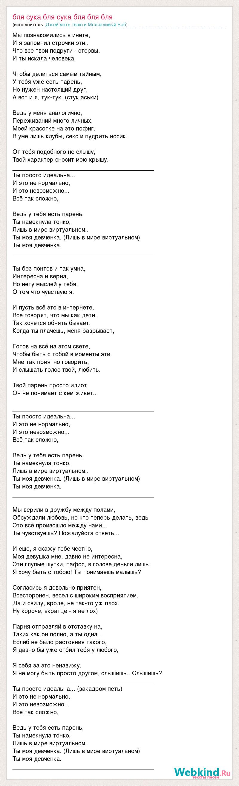 Мы познакомились в инете, И я запомнил строчки эти.. Что все твои подруги - стервы. И ты искала человека, Чтобы делиться самым тайным, У тебя уже есть парень, Но нужен настоящий друг, А вот и я, тук-тук. (стук аськи) Ведь у меня аналогично, Переживаний много личных, Моей красотке на это пофиг. В уме лишь клубы, секс и пудрить носик. От тебя подобного не слышу, Твой характер сносит мою крышу. ___________________________________________ Ты просто идеальна... И это не нормально, И это невозможно... Всё так сложно, Ведь у тебя есть парень, Ты намекнула тонко, Лишь в мире виртуальном.. Ты моя девченка. (Лишь в мире виртуальном) Ты моя девченка. ___________________________________________ Ты без понтов и так умна, Интересна и верна, Но нету мыслей у тебя, О том что чувствую я. И пусть всё это в интернете, Все говорят, что мы как дети, Так хочется обнять бывает, Когда ты плачешь, меня разрывает, Готов на всё на этом свете, Чтобы быть с тобой в моменты эти. Мне так приятно говорить, И слышать голос твой, любить. Твой парень просто идиот, Он не понимает с кем живет.. ___________________________________________ Ты просто идеальна... И это не нормально, И это невозможно... Всё так сложно, Ведь у тебя есть парень, Ты намекнула тонко, Лишь в мире виртуальном.. Ты моя девченка. (Лишь в мире виртуальном) Ты моя девченка. ___________________________________________ Мы верили в дружбу между полами, Обсуждали любовь, но что теперь делать, ведь Это всё произошло между нами... Ты чувствуешь? Пожалуйста ответь... И еще, я скажу тебе честно, Моя девушка мне, давно не интересна, Эти глупые шутки, пафос, в голове деньги лишь. Я хочу быть с тобою! Ты понимаешь малышь? Согласись я довольно приятен, Всесторонен, весел с широким восприятием. Да и свиду, вроде, не так-то уж плох. Ну короче, вкратце - я не лох) Парня отправляй в отставку на, Таких как он полно, а ты одна... Еслиб не было растояния такого, Я давно бы уже отбил тебя у любого, Я себя за это ненавижу. Я не могу быть просто другом, слышишь.. Слышишь? ___________________________________________ Ты просто идеальна... (закадром петь) И это не нормально, И это невозможно... Всё так сложно, Ведь у тебя есть парень, Ты намекнула тонко, Лишь в мире виртуальном.. Ты моя девченка. (Лишь в мире виртуальном) Ты моя девченка. ___________________________________________