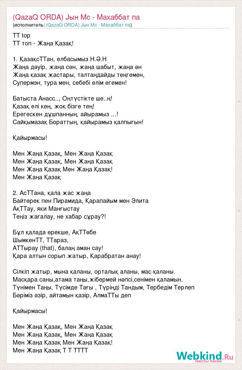 TT top ТТ топ - Жаңа Қазақ! 1. ҚазақсТТан, елбасымыз Н.Ә.Н Жаңа дәуір, жаңа сән, жаңа шабыт, жаңа ән Жаңа қазақ жастары, талтаңдайды теңгемен, Супермэн, тура мен, себебі елім егемен! Батыста Анасс.., Оңтүстікте ше..ң! Қазақ елі кең, жоқ бізге тең! Ерегескен дұшпанның, айырамыз ...! Сайқымазақ Бораттың, қайырамыз қалпығын! Қайырмасы! Мен Жаңа Қазақ, Мен Жаңа Қазақ Мен Жаңа Қазақ, Мен Жаңа Қазақ Мен Жаңа Қазақ Мен Жаңа Қазақ! Мен Жаңа Қазақ 2. АсТТана, қала жас жаңа Байтерек пен Пирамида, Қарапайым мен Элита АқТТау, яки Манғыстау Теңіз жағалау, не хабар сұрау?! Бұл қалада ерекше, АқТТөбе ШымкенТТ, ТТараз, АТТырау (that), балаң аман сау! Қара алтын сорып жатыр, Қарабратан анау! Сілкіп жатыр, мына қаланы, орталық аланы, мас қаланы. Масқара саны,атама таңы,жібермей нәпсі,сенімен қаламын. Түнімен Таңы, Түсімде Тағы , Түріңді Тандым, Тербедім Терлеп Бәріміз әзір, айтамын қазір, АлмаТТы деп Қайырмасы! Мен Жаңа Қазақ, Мен Жаңа Қазақ Мен Жаңа Қазақ, Мен Жаңа Қазақ Мен Жаңа Қазақ Мен Жаңа Қазақ! Мен Жаңа Қазақ Т Т ТТТТ