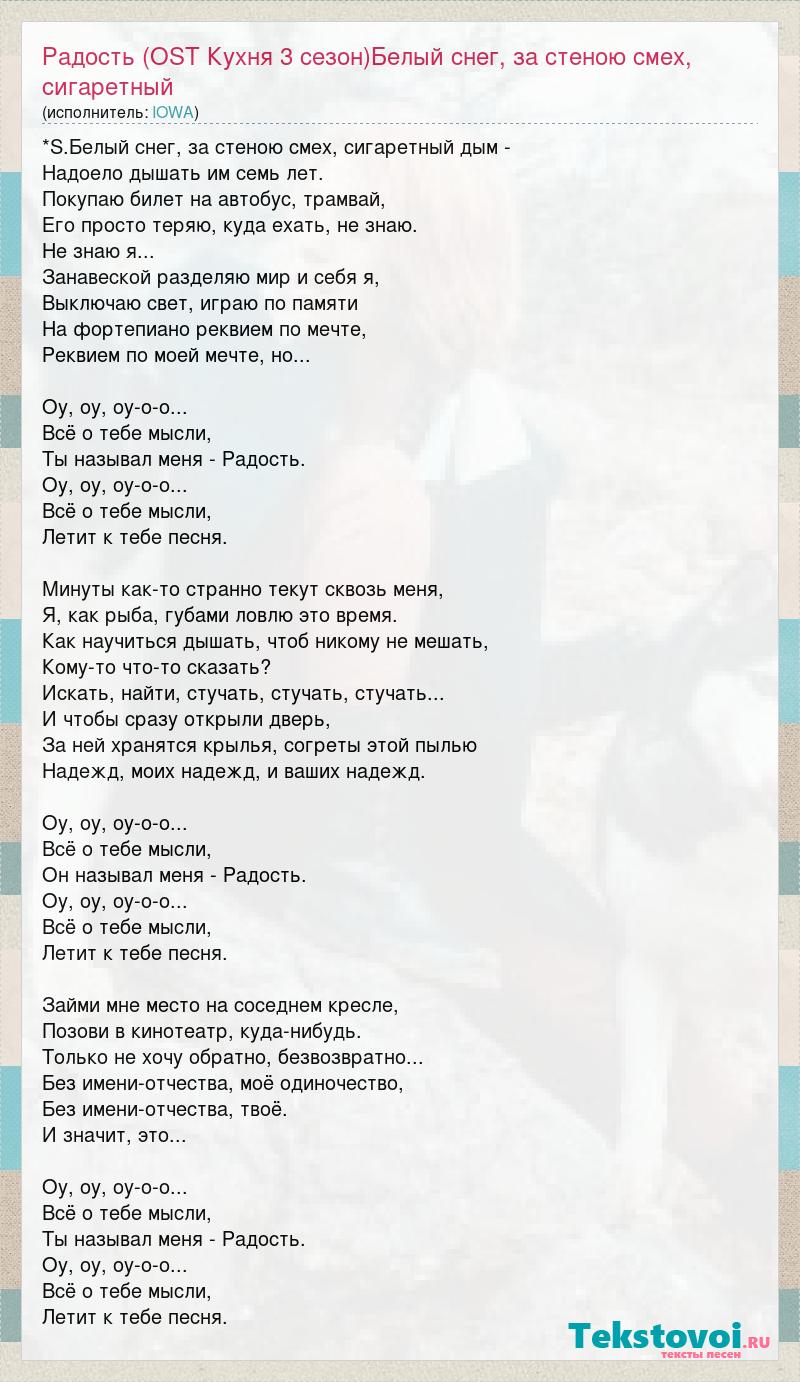*S.Белый снег, за стеною смех, сигаретный дым - Надоело дышать им семь лет. Покупаю билет на автобус, трамвай, Его просто теряю, куда ехать, не знаю. Не знаю я... Занавеской разделяю мир и себя я, Выключаю свет, играю по памяти На фортепиано реквием по мечте, Реквием по моей мечте, но... Оу, оу, оу-о-о... Всё о тебе мысли, Ты называл меня - Радость. Оу, оу, оу-о-о... Всё о тебе мысли, Летит к тебе песня. Минуты как-то странно текут сквозь меня, Я, как рыба, губами ловлю это время. Как научиться дышать, чтоб никому не мешать, Кому-то что-то сказать? Искать, найти, стучать, стучать, стучать... И чтобы сразу открыли дверь, За ней хранятся крылья, согреты этой пылью Надежд, моих надежд, и ваших надежд. Оу, оу, оу-о-о... Всё о тебе мысли, Он называл меня - Радость. Оу, оу, оу-о-о... Всё о тебе мысли, Летит к тебе песня. Займи мне место на соседнем кресле, Позови в кинотеатр, куда-нибудь. Только не хочу обратно, безвозвратно... Без имени-отчества, моё одиночество, Без имени-отчества, твоё. И значит, это... Оу, оу, оу-о-о... Всё о тебе мысли, Ты называл меня - Радость. Оу, оу, оу-о-о... Всё о тебе мысли, Летит к тебе песня.
