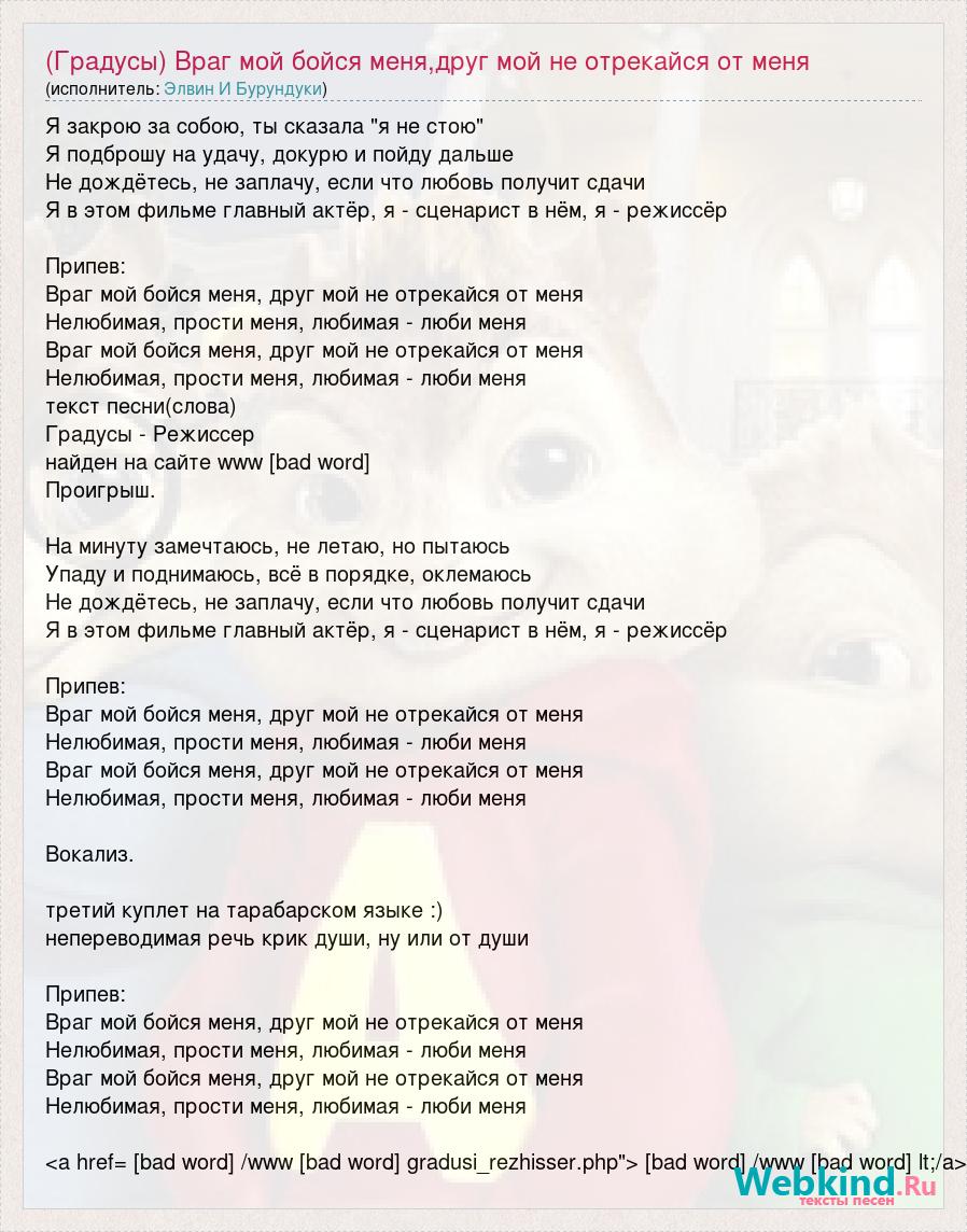 Я закрою за собою, ты сказала "я не стою" Я подброшу на удачу, докурю и пойду дальше Не дождётесь, не заплачу, если что любовь получит сдачи Я в этом фильме главный актёр, я - сценарист в нём, я - режиссёр Припев: Враг мой бойся меня, друг мой не отрекайся от меня Нелюбимая, прости меня, любимая - люби меня Враг мой бойся меня, друг мой не отрекайся от меня Нелюбимая, прости меня, любимая - люби меня текст песни(слова) Градусы - Режиссер найден на сайте www [bad word] Проигрыш. На минуту замечтаюсь, не летаю, но пытаюсь Упаду и поднимаюсь, всё в порядке, оклемаюсь Не дождётесь, не заплачу, если что любовь получит сдачи Я в этом фильме главный актёр, я - сценарист в нём, я - режиссёр Припев: Враг мой бойся меня, друг мой не отрекайся от меня Нелюбимая, прости меня, любимая - люби меня Враг мой бойся меня, друг мой не отрекайся от меня Нелюбимая, прости меня, любимая - люби меня Вокализ. третий куплет на тарабарском языке :) непереводимая речь крик души, ну или от души Припев: Враг мой бойся меня, друг мой не отрекайся от меня Нелюбимая, прости меня, любимая - люби меня Враг мой бойся меня, друг мой не отрекайся от меня Нелюбимая, прости меня, любимая - люби меня <a href= [bad word] /www [bad word] gradusi_rezhisser.php"> [bad word] /www [bad word] lt;/a>