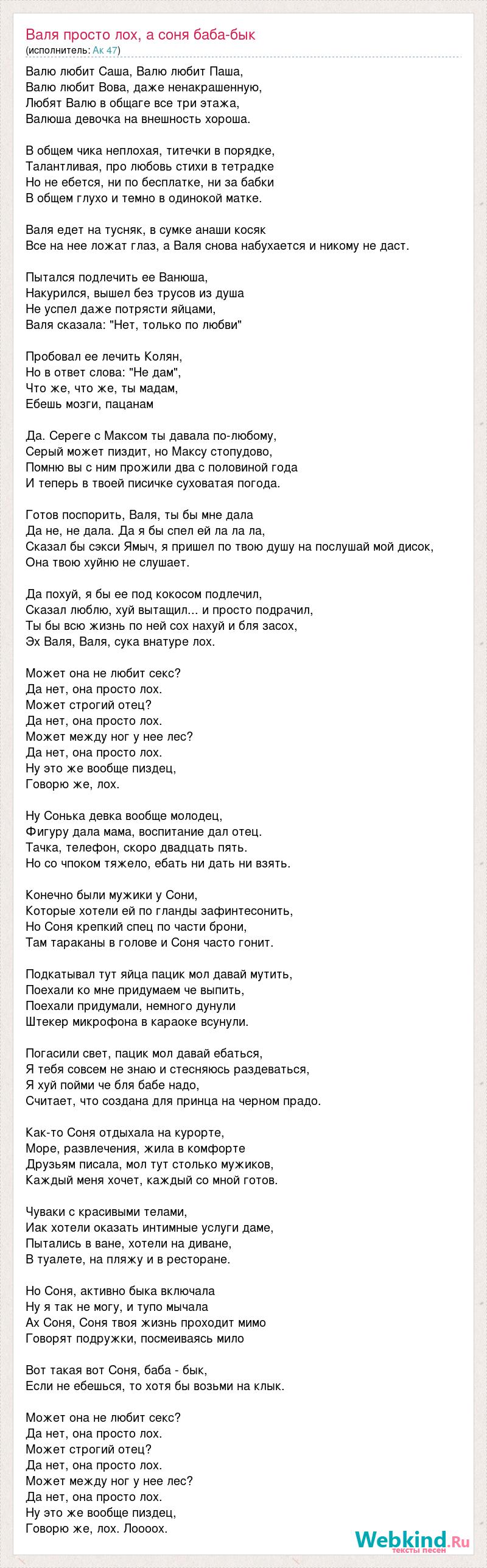 Валю любит Саша, Валю любит Паша, Валю любит Вова, даже ненакрашенную, Любят Валю в общаге все три этажа, Валюша девочка на внешность хороша. В общем чика неплохая, титечки в порядке, Талантливая, про любовь стихи в тетрадке Но не ебется, ни по бесплатке, ни за бабки В общем глухо и темно в одинокой матке. Валя едет на тусняк, в сумке анаши косяк Все на нее ложат глаз, а Валя снова набухается и никому не даст. Пытался подлечить ее Ванюша, Накурился, вышел без трусов из душа Не успел даже потрясти яйцами, Валя сказала: "Нет, только по любви" Пробовал ее лечить Колян, Но в ответ слова: "Не дам", Что же, что же, ты мадам, Ебешь мозги, пацанам Да. Сереге с Максом ты давала по-любому, Серый может пиздит, но Максу стопудово, Помню вы с ним прожили два с половиной года И теперь в твоей писичке суховатая погода. Готов поспорить, Валя, ты бы мне дала Да не, не дала. Да я бы спел ей ла ла ла, Сказал бы сэкси Ямыч, я пришел по твою душу на послушай мой дисок, Она твою хуйню не слушает. Да похуй, я бы ее под кокосом подлечил, Сказал люблю, хуй вытащил... и просто подрачил, Ты бы всю жизнь по ней сох нахуй и бля засох, Эх Валя, Валя, сука внатуре лох. Может она не любит секс? Да нет, она просто лох. Может строгий отец? Да нет, она просто лох. Может между ног у нее лес? Да нет, она просто лох. Ну это же вообще пиздец, Говорю же, лох. Ну Сонька девка вообще молодец, Фигуру дала мама, воспитание дал отец. Тачка, телефон, скоро двадцать пять. Но со чпоком тяжело, ебать ни дать ни взять. Конечно были мужики у Сони, Которые хотели ей по гланды зафинтесонить, Но Соня крепкий спец по части брони, Там тараканы в голове и Соня часто гонит. Подкатывал тут яйца пацик мол давай мутить, Поехали ко мне придумаем че выпить, Поехали придумали, немного дунули Штекер микрофона в караоке всунули. Погасили свет, пацик мол давай ебаться, Я тебя совсем не знаю и стесняюсь раздеваться, Я хуй пойми че бля бабе надо, Считает, что создана для принца на черном прадо. Как-то Соня отдыхала на курорте, Море, развлечения, жила в комфорте Друзьям писала, мол тут столько мужиков, Каждый меня хочет, каждый со мной готов. Чуваки с красивыми телами, Иак хотели оказать интимные услуги даме, Пытались в ване, хотели на диване, В туалете, на пляжу и в ресторане. Но Соня, активно быка включала Ну я так не могу, и тупо мычала Ах Соня, Соня твоя жизнь проходит мимо Говорят подружки, посмеиваясь мило Вот такая вот Соня, баба - бык, Если не ебешься, то хотя бы возьми на клык. Может она не любит секс? Да нет, она просто лох. Может строгий отец? Да нет, она просто лох. Может между ног у нее лес? Да нет, она просто лох. Ну это же вообще пиздец, Говорю же, лох. Лоооох.