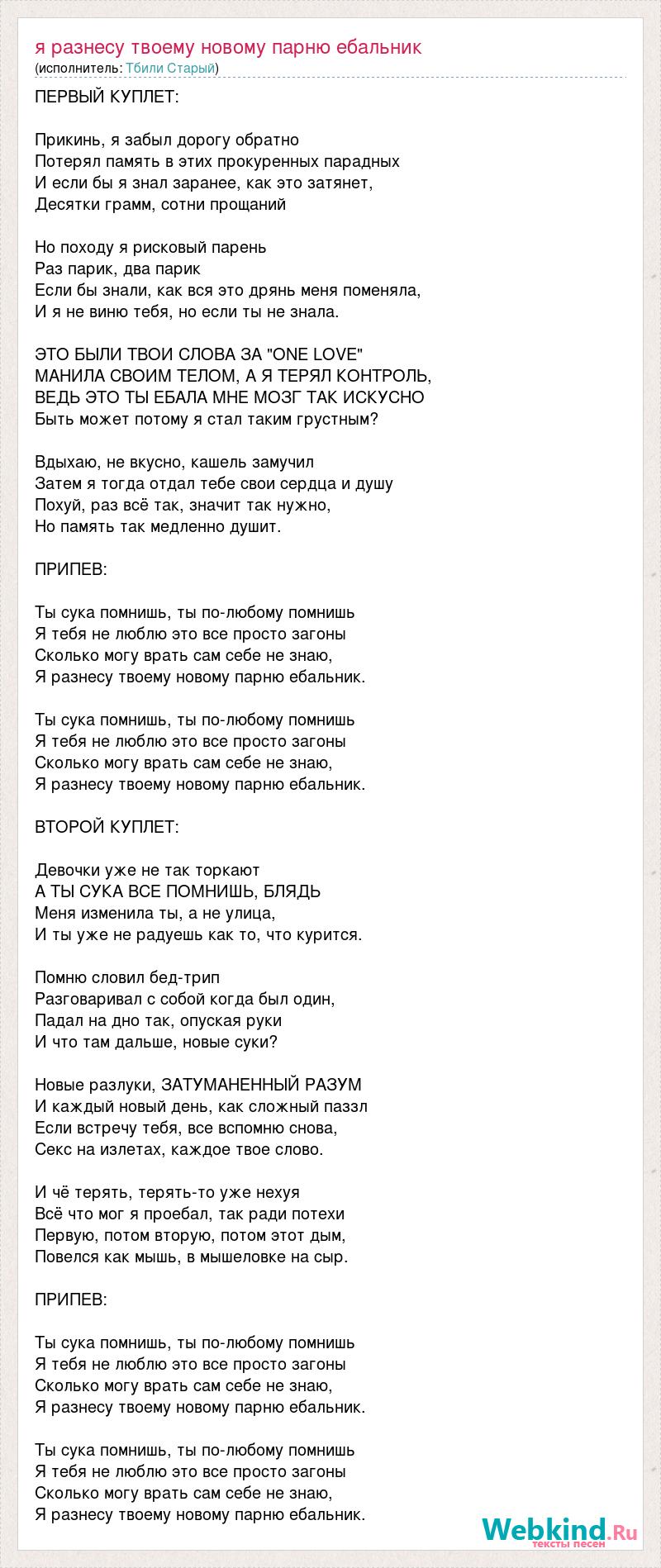 ПЕРВЫЙ КУПЛЕТ: Прикинь, я забыл дорогу обратно Потерял память в этих прокуренных парадных И если бы я знал заранее, как это затянет, Десятки грамм, сотни прощаний Но походу я рисковый парень Раз парик, два парик Если бы знали, как вся это дрянь меня поменяла, И я не виню тебя, но если ты не знала. ЭТО БЫЛИ ТВОИ СЛОВА ЗА "ONE LOVE" МАНИЛА СВОИМ ТЕЛОМ, А Я ТЕРЯЛ КОНТРОЛЬ, ВЕДЬ ЭТО ТЫ ЕБАЛА МНЕ МОЗГ ТАК ИСКУСНО Быть может потому я стал таким грустным? Вдыхаю, не вкусно, кашель замучил Затем я тогда отдал тебе свои сердца и душу Похуй, раз всё так, значит так нужно, Но память так медленно душит. ПРИПЕВ: Ты сука помнишь, ты по-любому помнишь Я тебя не люблю это все просто загоны Сколько могу врать сам себе не знаю, Я разнесу твоему новому парню ебальник. Ты сука помнишь, ты по-любому помнишь Я тебя не люблю это все просто загоны Сколько могу врать сам себе не знаю, Я разнесу твоему новому парню ебальник. ВТОРОЙ КУПЛЕТ: Девочки уже не так торкают А ТЫ СУКА ВСЕ ПОМНИШЬ, БЛЯДЬ Меня изменила ты, а не улица, И ты уже не радуешь как то, что курится. Помню словил бед-трип Разговаривал с собой когда был один, Падал на дно так, опуская руки И что там дальше, новые суки? Новые разлуки, ЗАТУМАНЕННЫЙ РАЗУМ И каждый новый день, как сложный паззл Если встречу тебя, все вспомню снова, Секс на излетах, каждое твое слово. И чё терять, терять-то уже нехуя Всё что мог я проебал, так ради потехи Первую, потом вторую, потом этот дым, Повелся как мышь, в мышеловке на сыр. ПРИПЕВ: Ты сука помнишь, ты по-любому помнишь Я тебя не люблю это все просто загоны Сколько могу врать сам себе не знаю, Я разнесу твоему новому парню ебальник. Ты сука помнишь, ты по-любому помнишь Я тебя не люблю это все просто загоны Сколько могу врать сам себе не знаю, Я разнесу твоему новому парню ебальник.