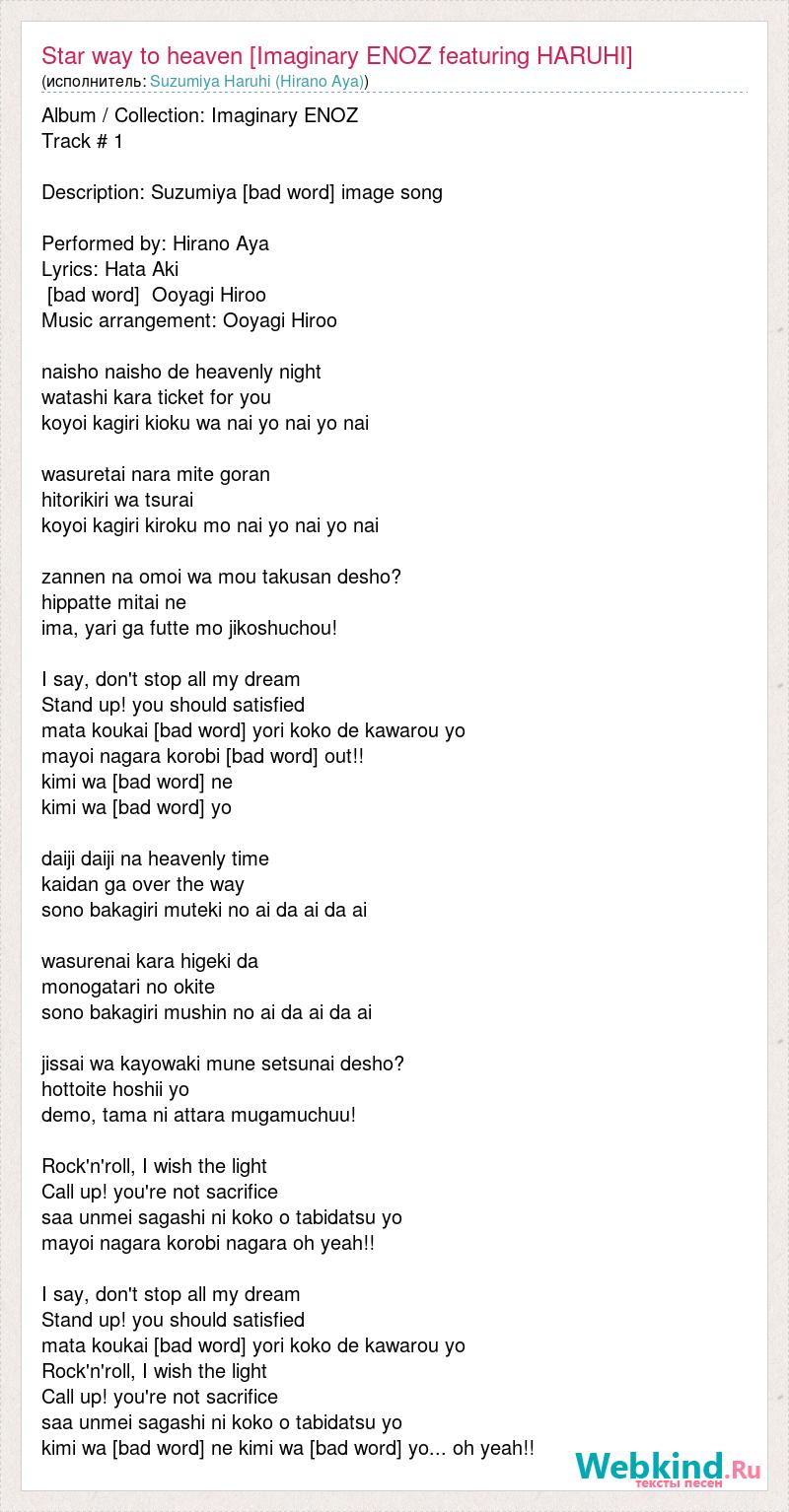 Album / Collection: Imaginary ENOZ Track # 1 Description: Suzumiya [bad word] image song Performed by: Hirano Aya Lyrics: Hata Aki [bad word] Ooyagi Hiroo Music arrangement: Ooyagi Hiroo naisho naisho de heavenly night watashi kara ticket for you koyoi kagiri kioku wa nai yo nai yo nai wasuretai nara mite goran hitorikiri wa tsurai koyoi kagiri kiroku mo nai yo nai yo nai zannen na omoi wa mou takusan desho? hippatte mitai ne ima, yari ga futte mo jikoshuchou! I say, don't stop all my dream Stand up! you should satisfied mata koukai [bad word] yori koko de kawarou yo mayoi nagara korobi [bad word] out!! kimi wa [bad word] ne kimi wa [bad word] yo daiji daiji na heavenly time kaidan ga over the way sono bakagiri muteki no ai da ai da ai wasurenai kara higeki da monogatari no okite sono bakagiri mushin no ai da ai da ai jissai wa kayowaki mune setsunai desho? hottoite hoshii yo demo, tama ni attara mugamuchuu! Rock'n'roll, I wish the light Call up! you're not sacrifice saa unmei sagashi ni koko o tabidatsu yo mayoi nagara korobi nagara oh yeah!! I say, don't stop all my dream Stand up! you should satisfied mata koukai [bad word] yori koko de kawarou yo Rock'n'roll, I wish the light Call up! you're not sacrifice saa unmei sagashi ni koko o tabidatsu yo kimi wa [bad word] ne kimi wa [bad word] yo... oh yeah!!