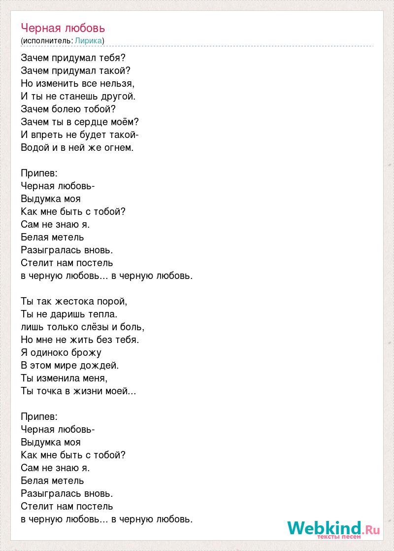 Зачем придумал тебя? Зачем придумал такой? Но изменить все нельзя, И ты не станешь другой. Зачем болею тобой? Зачем ты в сердце моём? И впреть не будет такой- Водой и в ней же огнем. Припев: Черная любовь- Выдумка моя Как мне быть с тобой? Сам не знаю я. Белая метель Разыгралась вновь. Стелит нам постель в черную любовь... в черную любовь. Ты так жестока порой, Ты не даришь тепла. лишь только слёзы и боль, Но мне не жить без тебя. Я одиноко брожу В этом мире дождей. Ты изменила меня, Ты точка в жизни моей... Припев: Черная любовь- Выдумка моя Как мне быть с тобой? Сам не знаю я. Белая метель Разыгралась вновь. Стелит нам постель в черную любовь... в черную любовь.