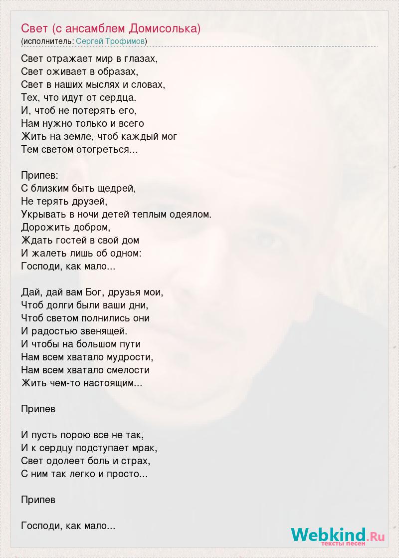 Свет отражает мир в глазах, Свет оживает в образах, Свет в наших мыслях и словах, Тех, что идут от сердца. И, чтоб не потерять его, Нам нужно только и всего Жить на земле, чтоб каждый мог Тем светом отогреться... Припев: С близким быть щедрей, Не терять друзей, Укрывать в ночи детей теплым одеялом. Дорожить добром, Ждать гостей в свой дом И жалеть лишь об одном: Господи, как мало... Дай, дай вам Бог, друзья мои, Чтоб долги были ваши дни, Чтоб светом полнились они И радостью звенящей. И чтобы на большом пути Нам всем хватало мудрости, Нам всем хватало смелости Жить чем-то настоящим... Припев И пусть порою все не так, И к сердцу подступает мрак, Свет одолеет боль и страх, С ним так легко и просто... Припев Господи, как мало...