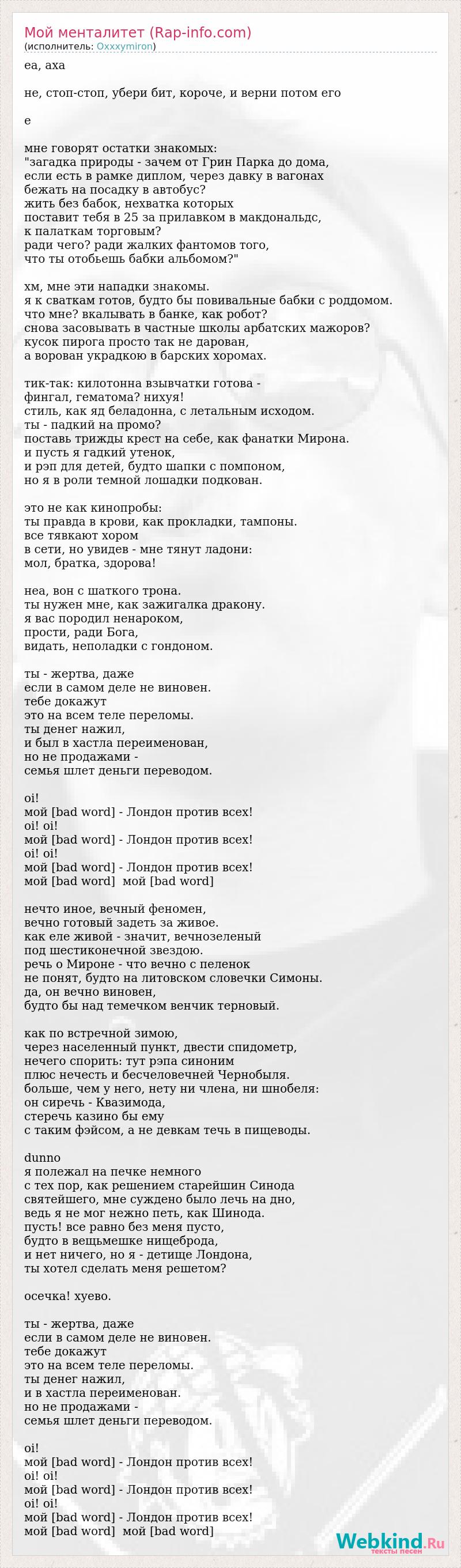 еа, аха не, стоп-стоп, убери бит, короче, и верни потом его е мне говорят остатки знакомых: "загадка природы - зачем от Грин Парка до дома, если есть в рамке диплом, через давку в вагонах бежать на посадку в автобус? жить без бабок, нехватка которых поставит тебя в 25 за прилавком в макдональдс, к палаткам торговым? ради чего? ради жалких фантомов того, что ты отобьешь бабки альбомом?" хм, мне эти нападки знакомы. я к сваткам готов, будто бы повивальные бабки с роддомом. что мне? вкалывать в банке, как робот? снова засовывать в частные школы арбатских мажоров? кусок пирога просто так не дарован, а ворован украдкою в барских хоромах. тик-так: килотонна взывчатки готова - фингал, гематома? нихуя! стиль, как яд беладонна, с летальным исходом. ты - падкий на промо? поставь трижды крест на себе, как фанатки Мирона. и пусть я гадкий утенок, и рэп для детей, будто шапки с помпоном, но я в роли темной лошадки подкован. это не как кинопробы: ты правда в крови, как прокладки, тампоны. все тявкают хором в сети, но увидев - мне тянут ладони: мол, братка, здорова! неа, вон с шаткого трона. ты нужен мне, как зажигалка дракону. я вас породил ненароком, прости, ради Бога, видать, неполадки с гондоном. ты - жертва, даже если в самом деле не виновен. тебе докажут это на всем теле переломы. ты денег нажил, и был в хастла переименован, но не продажами - семья шлет деньги переводом. oi! мой [bad word] - Лондон против всех! oi! oi! мой [bad word] - Лондон против всех! oi! oi! мой [bad word] - Лондон против всех! мой [bad word] мой [bad word] нечто иное, вечный феномен, вечно готовый задеть за живое. как еле живой - значит, вечнозеленый под шестиконечной звездою. речь о Мироне - что вечно с пеленок не понят, будто на литовском словечки Симоны. да, он вечно виновен, будто бы над темечком венчик терновый. как по встречной зимою, через населенный пункт, двести спидометр, нечего спорить: тут рэпа синоним плюс нечесть и бесчеловечней Чернобыля. больше, чем у него, нету ни члена, ни шнобеля: он сиречь - Квазимода, стеречь казино бы ему с таким фэйсом, а не девкам течь в пищеводы. dunno я полежал на печке немного с тех пор, как решением старейшин Синода святейшего, мне суждено было лечь на дно, ведь я не мог нежно петь, как Шинода. пусть! все равно без меня пусто, будто в вещьмешке нищеброда, и нет ничего, но я - детище Лондона, ты хотел сделать меня решетом? осечка! хуево. ты - жертва, даже если в самом деле не виновен. тебе докажут это на всем теле переломы. ты денег нажил, и в хастла переименован. но не продажами - семья шлет деньги переводом. oi! мой [bad word] - Лондон против всех! oi! oi! мой [bad word] - Лондон против всех! oi! oi! мой [bad word] - Лондон против всех! мой [bad word] мой [bad word]