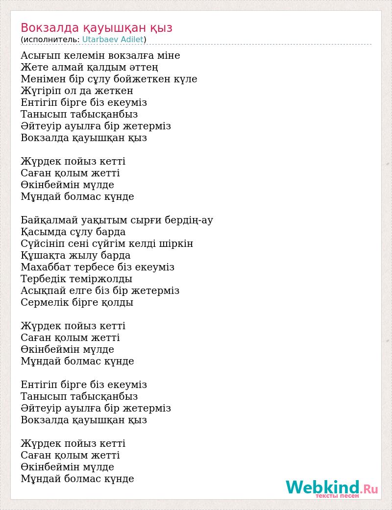 Асығып келемін вокзалға міне Жете алмай қалдым әттең Менімен бір сұлу бойжеткен күле Жүгіріп ол да жеткен Ентігіп бірге біз екеуміз Танысып табысқанбыз Әйтеуір ауылға бір жетерміз Вокзалда қауышқан қыз Жүрдек пойыз кетті Саған қолым жетті Өкінбеймін мүлде Мұндай болмас күнде Байқалмай уақытым сырғи бердің-ау Қасымда сұлу барда Сүйсініп сені сүйгім келді шіркін Құшақта жылу барда Махаббат тербесе біз екеуміз Тербедік теміржолды Асықпай елге біз бір жетерміз Сермелік бірге қолды Жүрдек пойыз кетті Саған қолым жетті Өкінбеймін мүлде Мұндай болмас күнде Ентігіп бірге біз екеуміз Танысып табысқанбыз Әйтеуір ауылға бір жетерміз Вокзалда қауышқан қыз Жүрдек пойыз кетті Саған қолым жетті Өкінбеймін мүлде Мұндай болмас күнде