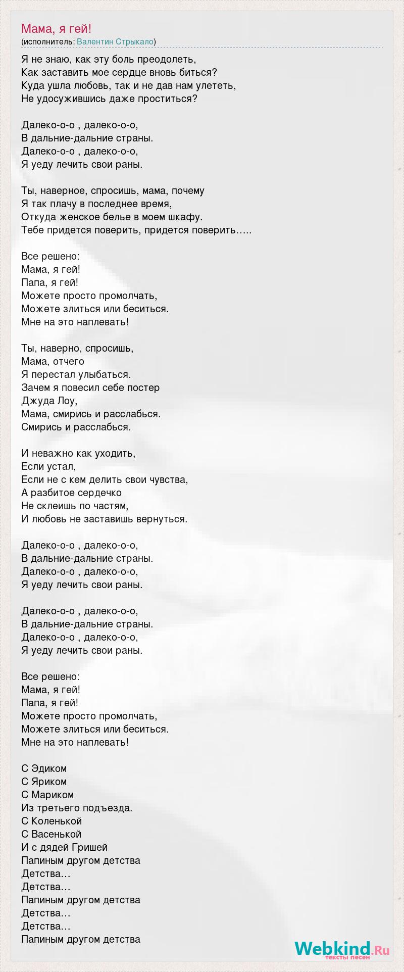 Я не знаю, как эту боль преодолеть, Как заставить мое сердце вновь биться? Куда ушла любовь, так и не дав нам улететь, Не удосужившись даже проститься? Далеко-о-о , далеко-о-о, В дальние-дальние страны. Далеко-о-о , далеко-о-о, Я уеду лечить свои раны. Ты, наверное, спросишь, мама, почему Я так плачу в последнее время, Откуда женское белье в моем шкафу. Тебе придется поверить, придется поверить….. Все решено: Мама, я гей! Папа, я гей! Можете просто промолчать, Можете злиться или беситься. Мне на это наплевать! Ты, наверно, спросишь, Мама, отчего Я перестал улыбаться. Зачем я повесил себе постер Джуда Лоу, Мама, смирись и расслабься. Смирись и расслабься. И неважно как уходить, Если устал, Если не с кем делить свои чувства, А разбитое сердечко Не склеишь по частям, И любовь не заставишь вернуться. Далеко-о-о , далеко-о-о, В дальние-дальние страны. Далеко-о-о , далеко-о-о, Я уеду лечить свои раны. Далеко-о-о , далеко-о-о, В дальние-дальние страны. Далеко-о-о , далеко-о-о, Я уеду лечить свои раны. Все решено: Мама, я гей! Папа, я гей! Можете просто промолчать, Можете злиться или беситься. Мне на это наплевать! С Эдиком С Яриком С Мариком Из третьего подъезда. С Коленькой С Васенькой И с дядей Гришей Папиным другом детства Детства… Детства… Папиным другом детства Детства… Детства… Папиным другом детства