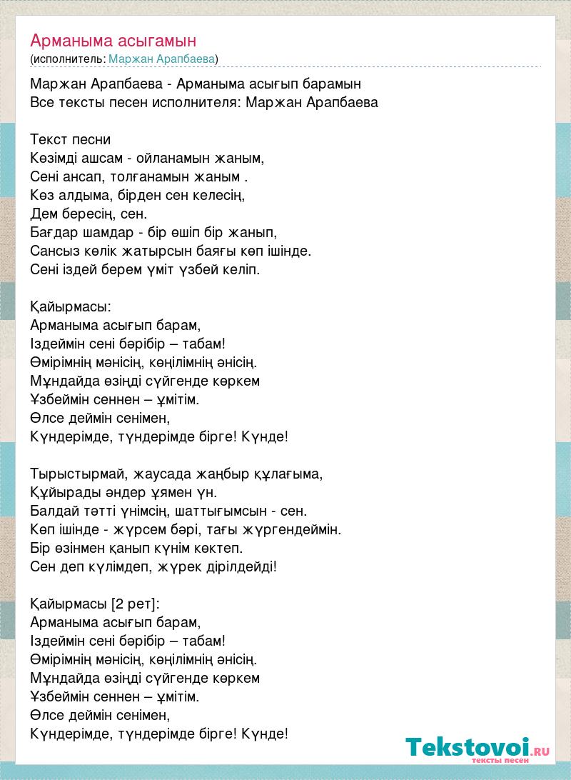 Маржан Арапбаева - Арманыма асығып барамын Все тексты песен исполнителя: Маржан Арапбаева Текст песни Көзімді ашсам - ойланамын жаным, Сені ансап, толғанамын жаным . Көз алдыма, бірден сен келесің, Дем бересің, сен. Бағдар шамдар - бір өшіп бір жанып, Сансыз көлік жатырсын баяғы көп ішінде. Сені іздей берем үміт үзбей келіп. Қайырмасы: Арманыма асығып барам, Іздеймін сені бәрібір – табам! Өмірімнің мәнісің, көңілімнің әнісің. Мұндайда өзіңді сүйгенде көркем Ұзбеймін сеннен – ұмітім. Өлсе деймін сенімен, Күндерімде, түндерімде бірге! Күнде! Тырыстырмай, жаусада жаңбыр құлағыма, Құйырады әндер ұямен үн. Балдай тәтті үнімсің, шаттығымсын - сен. Көп ішінде - жүрсем бәрі, тағы жүргендеймін. Бір өзінмен қанып күнім көктеп. Сен деп күлімдеп, жүрек дірілдейді! Қайырмасы [2 рет]: Арманыма асығып барам, Іздеймін сені бәрібір – табам! Өмірімнің мәнісің, көңілімнің әнісің. Мұндайда өзіңді сүйгенде көркем Ұзбеймін сеннен – ұмітім. Өлсе деймін сенімен, Күндерімде, түндерімде бірге! Күнде!
