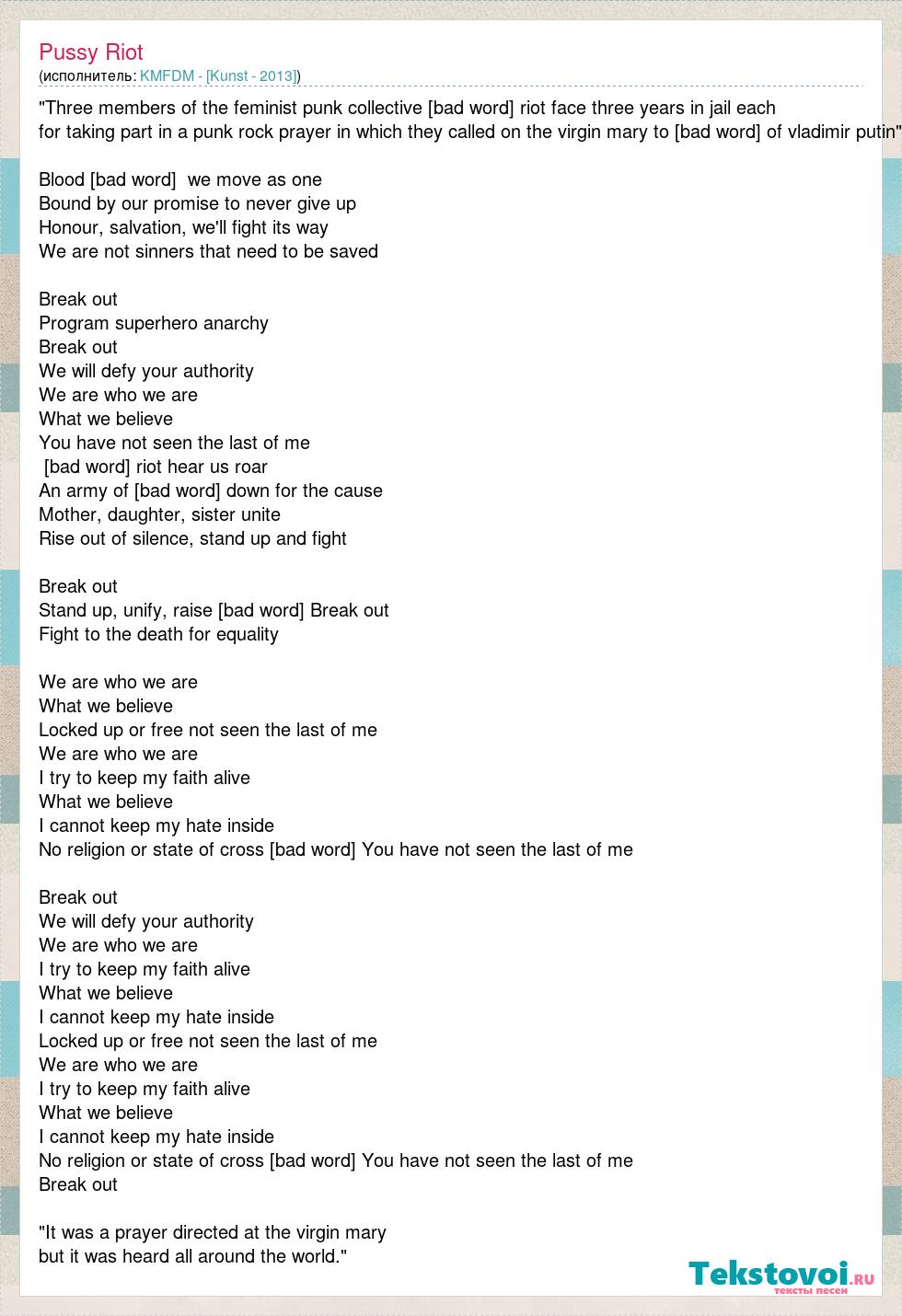 "Three members of the feminist punk collective [bad word] riot face three years in jail each for taking part in a punk rock prayer in which they called on the virgin mary to rid Russia of vladimir putin" Blood sister comrade, we move as one Bound by our promise to never give up Honour, salvation, we'll fight its way We are not sinners that need to be saved Break out Program superhero anarchy Break out We will defy your authority We are who we are What we believe You have not seen the last of me [bad word] riot hear us roar An army of [bad word] down for the cause Mother, daughter, sister unite Rise out of silence, stand up and fight Break out Stand up, unify, raise hell Break out Fight to the death for equality We are who we are What we believe Locked up or free not seen the last of me We are who we are I try to keep my faith alive What we believe I cannot keep my hate inside No religion or state of cross brutality You have not seen the last of me Break out We will defy your authority We are who we are I try to keep my faith alive What we believe I cannot keep my hate inside Locked up or free not seen the last of me We are who we are I try to keep my faith alive What we believe I cannot keep my hate inside No religion or state of cross brutality You have not seen the last of me Break out "It was a prayer directed at the virgin mary but it was heard all around the world."