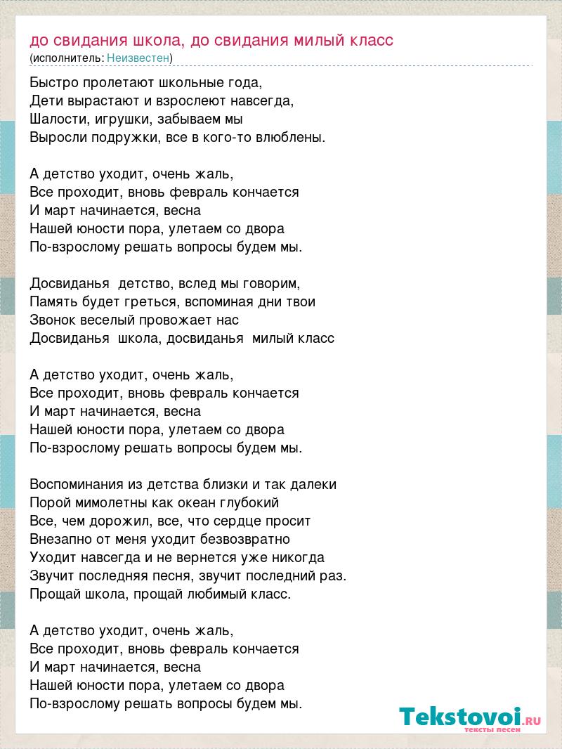 Быстро пролетают школьные года, Дети вырастают и взрослеют навсегда, Шалости, игрушки, забываем мы Выросли подружки, все в кого-то влюблены. А детство уходит, очень жаль, Все проходит, вновь февраль кончается И март начинается, весна Нашей юности пора, улетаем со двора По-взрослому решать вопросы будем мы. Досвиданья детство, вслед мы говорим, Память будет греться, вспоминая дни твои Звонок веселый провожает нас Досвиданья школа, досвиданья милый класс А детство уходит, очень жаль, Все проходит, вновь февраль кончается И март начинается, весна Нашей юности пора, улетаем со двора По-взрослому решать вопросы будем мы. Воспоминания из детства близки и так далеки Порой мимолетны как океан глубокий Все, чем дорожил, все, что сердце просит Внезапно от меня уходит безвозвратно Уходит навсегда и не вернется уже никогда Звучит последняя песня, звучит последний раз. Прощай школа, прощай любимый класс. А детство уходит, очень жаль, Все проходит, вновь февраль кончается И март начинается, весна Нашей юности пора, улетаем со двора По-взрослому решать вопросы будем мы.