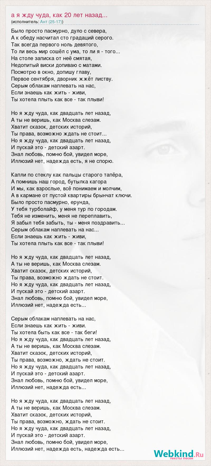 Было просто пасмурно, дуло с севера, А к обеду насчитал сто градаций серого. Так всегда первого ноль девятого, То ли весь мир сошёл с ума, то ли я - того... На столе записка от неё смятая, Недопитый виски допиваю с матами. Посмотрю в окно, допишу главу, Первое сентября, дворник жжёт листву. Серым облакам наплевать на нас, Если знаешь как жить - живи, Ты хотела плыть как все - так плыви! Но я жду чуда, как двадцать лет назад, А ты не веришь, как Москва слезам. Хватит сказок, детских историй, Ты права, возможно ждать не стоит... Но я жду чуда, как двадцать лет назад, И пускай это - детский азарт. Знал любовь, помню бой, увидел море, Иллюзий нет, надежда есть, я не спорю. Капли по стеклу как пальцы старого тапёра, А помнишь наш город, бутылка кагора И мы, как взрослые, всё понимаем и молчим, А в кармане от пустой квартиры брынчат ключи. Было просто пасмурно, ерунда, У тебя турболайф, у меня тур по городам. Тебя не изменить, меня не переплавить, Я забыл тебя забыть, ты - меня поздравить... Серым облакам наплевать на нас... Если знаешь как жить - живи, Ты хотела плыть как все - так плыви! Но я жду чуда, как двадцать лет назад, А ты не веришь, как Москва слезам. Хватит сказок, детских историй, Ты права, возможно ждать не стоит. Но я жду чуда, как двадцать лет назад, И пускай это - детский азарт. Знал любовь, помню бой, увидел море, Иллюзий нет, надежда есть... Серым облакам наплевать на нас, Если знаешь как жить - живи. Ты хотела быть как все - так беги! Но я жду чуда, как двадцать лет назад, А ты не веришь, как Москва слезам. Хватит сказок, детских историй, Ты права, возможно, ждать не стоит. Но я жду чуда, как двадцать лет назад, И пускай это - детский азарт. Знал любовь, помню бой, увидел море, Иллюзий нет, надежда есть... Но я жду чуда, как двадцать лет назад, А ты не веришь, как Москва слезам. Хватит сказок, детских историй, Ты права, возможно, ждать не стоит. Но я жду чуда, как двадцать лет назад, И пускай это - детский азарт. Знал любовь, помню бой, увидел море, Иллюзий нет, надежда есть, надежда есть...