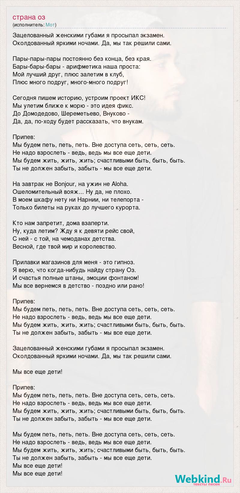 Зацелованный женскими губами я просыпал экзамен. Околдованный яркими ночами. Да, мы так решили сами. Пары-пары-пары постоянно без конца, без края. Бары-бары-бары - арифметика наша проста: Мой лучший друг, плюс залетим в клуб, Плюс много подруг, много-много подруг! Сегодня пишем историю, устроим проект ИКС! Мы улетим ближе к морю - это идея фикс. До Домодедово, Шереметьево, Внуково - Да, да, по-ходу будет рассказать, что внукам. Припев: Мы будем петь, петь, петь. Вне доступа сеть, сеть, сеть. Не надо взрослеть - ведь, ведь мы все еще дети. Мы будем жить, жить, жить; счастливыми быть, быть, быть. Ты не должен забыть, забыть - мы все еще дети. На завтрак не Bonjour, на ужин не Aloha. Ошеломительный вояж... Ну да, не плохо. В моем шкафу нету ни Нарнии, ни телепорта - Только билеты на руках до лучшего курорта. Кто нам запретит, дома взаперти. Ну, куда летим? Жду я к девяти рейс свой, С ней - с той, на чемоданах детства. Весной, где твой мир и королевство. Прилавки магазинов для меня - это гипноз. Я верю, что когда-нибудь найду страну Оз. И счастья полные штаны, эмоции фонтаном! Мы все вернемся в детство - поздно или рано! Припев: Мы будем петь, петь, петь. Вне доступа сеть, сеть, сеть. Не надо взрослеть - ведь, ведь мы все еще дети. Мы будем жить, жить, жить; счастливыми быть, быть, быть. Ты не должен забыть, забыть - мы все еще дети. Зацелованный женскими губами я просыпал экзамен. Околдованный яркими ночами. Да, мы так решили сами. Мы все еще дети! Припев: Мы будем петь, петь, петь. Вне доступа сеть, сеть, сеть. Не надо взрослеть - ведь, ведь мы все еще дети. Мы будем жить, жить, жить; счастливыми быть, быть, быть. Ты не должен забыть, забыть - мы все еще дети. Мы будем петь, петь, петь. Вне доступа сеть, сеть, сеть. Не надо взрослеть - ведь, ведь мы все еще дети. Мы будем жить, жить, жить; счастливыми быть, быть, быть. Ты не должен забыть, забыть - мы все еще дети. Мы все еще дети! Мы все еще дети!
