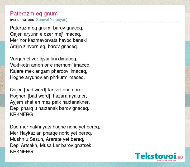 Paterazm eq gnum, barov gnaceq, Qajeri aryunn e dzer mej' imaceq, Mer nor kazmavorvats hayoc banaki Arajin zinvorn eq, barov gnaceq. Vorqan el vor djvar lini dimaceq, Vakhkotn amen or e mernum' imaceq, Kajere mek angam pharqov' imaceq, Hoghe aryunov en phrkum' imaceq. Qajeri korustov tanjvel enq darer, Hogheri korustov' hazaramyakner, Ayjem shat en mez petk haxtanakner, Dep' pharq u haxtanak barov gnaceq. KRKNERG Duq mer nakhnyats hoghe noric yet bereq, Mer Haykazian pharqe noric yet bereq, Mushn u Sasun, Ararate yet bereq, Dep' Artsakh, Musa Ler barov gnatsek. KRKNERG