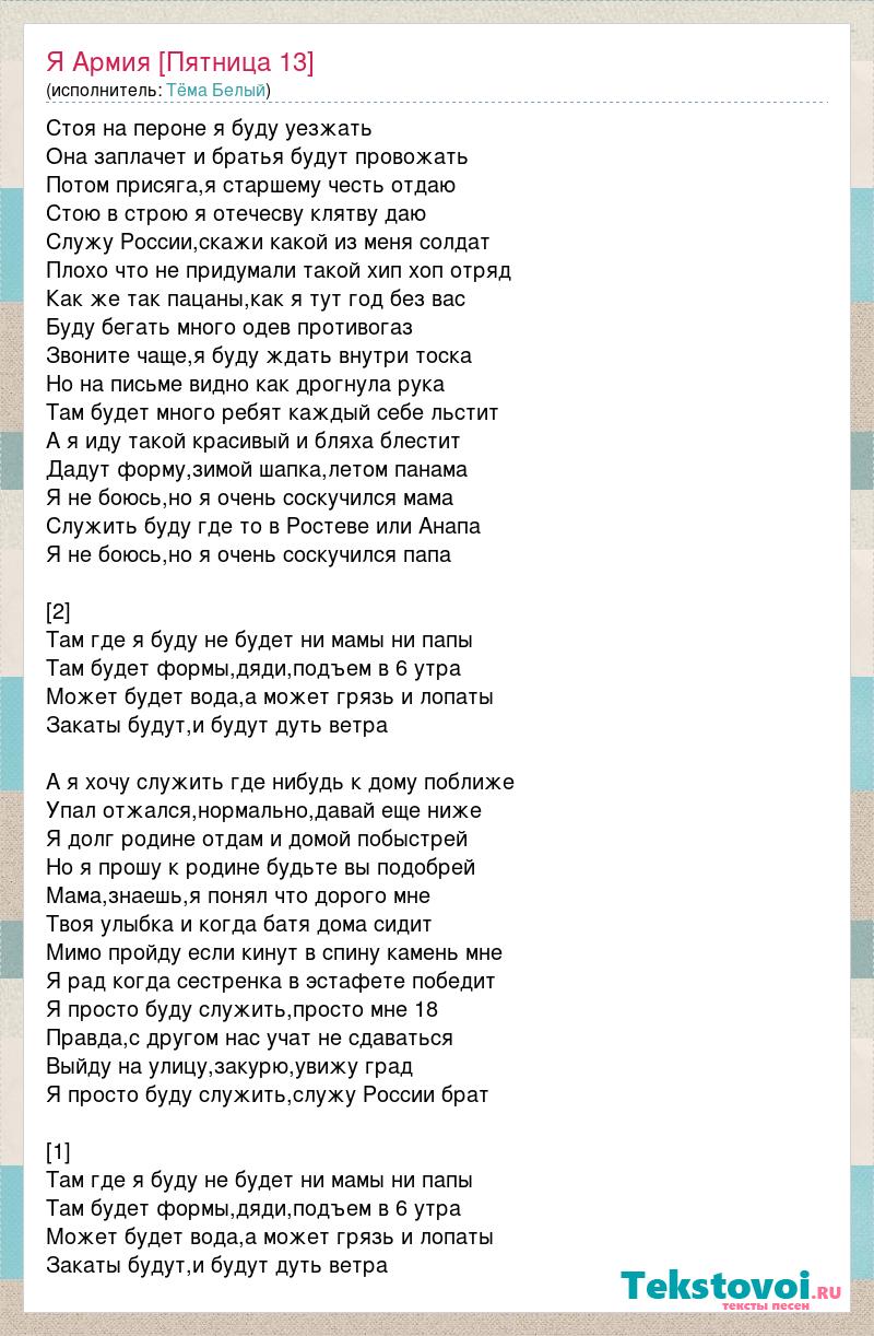 Стоя на пероне я буду уезжать Она заплачет и братья будут провожать Потом присяга,я старшему честь отдаю Стою в строю я отечесву клятву даю Служу России,скажи какой из меня солдат Плохо что не придумали такой хип хоп отряд Как же так пацаны,как я тут год без вас Буду бегать много одев противогаз Звоните чаще,я буду ждать внутри тоска Но на письме видно как дрогнула рука Там будет много ребят каждый себе льстит А я иду такой красивый и бляха блестит Дадут форму,зимой шапка,летом панама Я не боюсь,но я очень соскучился мама Служить буду где то в Ростеве или Анапа Я не боюсь,но я очень соскучился папа [2] Там где я буду не будет ни мамы ни папы Там будет формы,дяди,подъем в 6 утра Может будет вода,а может грязь и лопаты Закаты будут,и будут дуть ветра А я хочу служить где нибудь к дому поближе Упал отжался,нормально,давай еще ниже Я долг родине отдам и домой побыстрей Но я прошу к родине будьте вы подобрей Мама,знаешь,я понял что дорого мне Твоя улыбка и когда батя дома сидит Мимо пройду если кинут в спину камень мне Я рад когда сестренка в эстафете победит Я просто буду служить,просто мне 18 Правда,с другом нас учат не сдаваться Выйду на улицу,закурю,увижу град Я просто буду служить,служу России брат [1] Там где я буду не будет ни мамы ни папы Там будет формы,дяди,подъем в 6 утра Может будет вода,а может грязь и лопаты Закаты будут,и будут дуть ветра