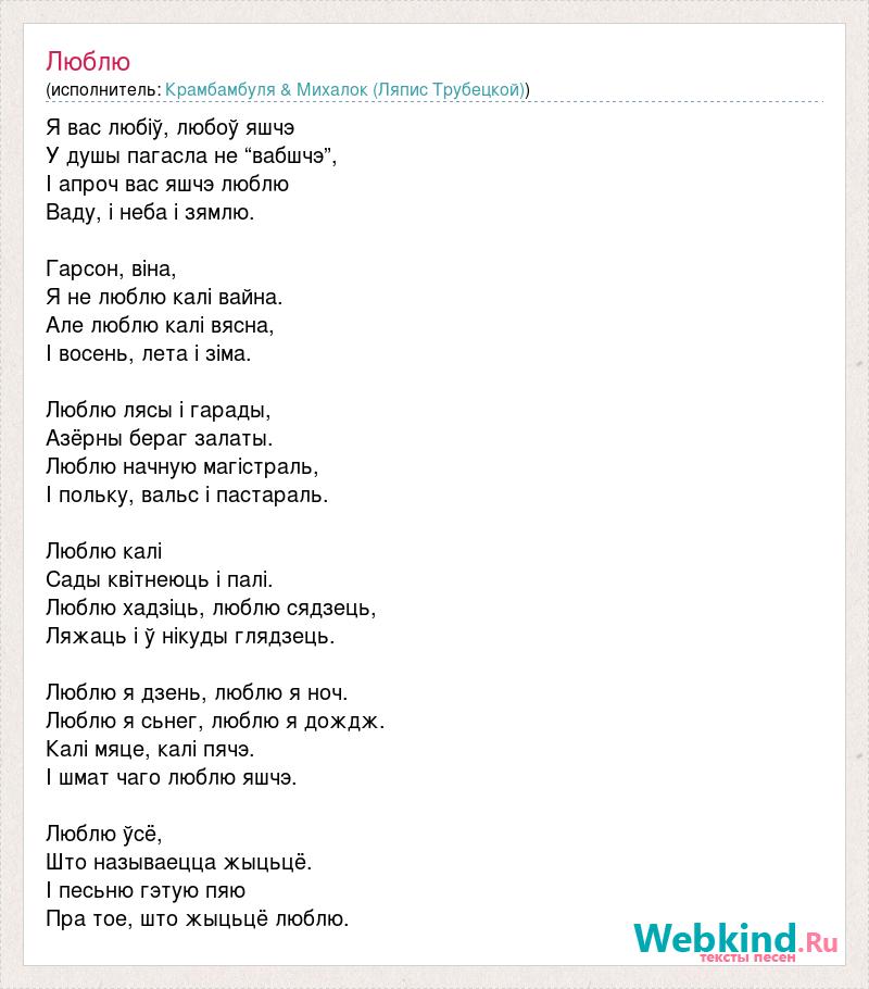 Я вас любіў, любоў яшчэ У душы пагасла не “вабшчэ”, І апроч вас яшчэ люблю Ваду, і неба і зямлю. Гарсон, віна, Я не люблю калі вайна. Але люблю калі вясна, І восень, лета і зіма. Люблю лясы і гарады, Азёрны бераг залаты. Люблю начную магістраль, І польку, вальс і пастараль. Люблю калі Сады квітнеюць і палі. Люблю хадзіць, люблю сядзець, Ляжаць і ў нікуды глядзець. Люблю я дзень, люблю я ноч. Люблю я сьнег, люблю я дождж. Калі мяце, калі пячэ. І шмат чаго люблю яшчэ. Люблю ўсё, Што называецца жыцьцё. І песьню гэтую пяю Пра тое, што жыцьцё люблю.