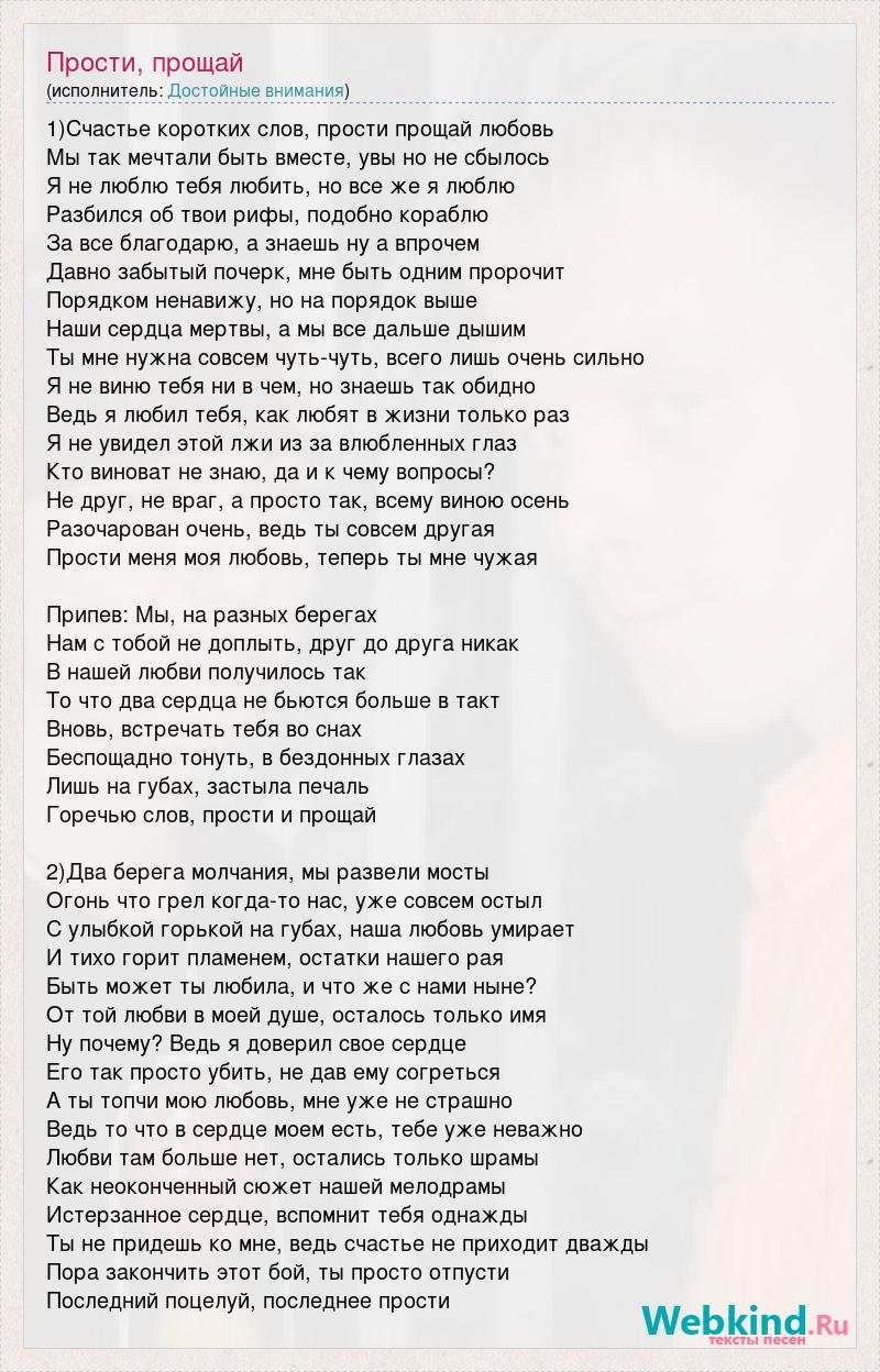1)Счастье коротких слов, прости прощай любовь Мы так мечтали быть вместе, увы но не сбылось Я не люблю тебя любить, но все же я люблю Разбился об твои рифы, подобно кораблю За все благодарю, а знаешь ну а впрочем Давно забытый почерк, мне быть одним пророчит Порядком ненавижу, но на порядок выше Наши сердца мертвы, а мы все дальше дышим Ты мне нужна совсем чуть-чуть, всего лишь очень сильно Я не виню тебя ни в чем, но знаешь так обидно Ведь я любил тебя, как любят в жизни только раз Я не увидел этой лжи из за влюбленных глаз Кто виноват не знаю, да и к чему вопросы? Не друг, не враг, а просто так, всему виною осень Разочарован очень, ведь ты совсем другая Прости меня моя любовь, теперь ты мне чужая Припев: Мы, на разных берегах Нам с тобой не доплыть, друг до друга никак В нашей любви получилось так То что два сердца не бьются больше в такт Вновь, встречать тебя во снах Беспощадно тонуть, в бездонных глазах Лишь на губах, застыла печаль Горечью слов, прости и прощай 2)Два берега молчания, мы развели мосты Огонь что грел когда-то нас, уже совсем остыл С улыбкой горькой на губах, наша любовь умирает И тихо горит пламенем, остатки нашего рая Быть может ты любила, и что же с нами ныне? От той любви в моей душе, осталось только имя Ну почему? Ведь я доверил свое сердце Его так просто убить, не дав ему согреться А ты топчи мою любовь, мне уже не страшно Ведь то что в сердце моем есть, тебе уже неважно Любви там больше нет, остались только шрамы Как неоконченный сюжет нашей мелодрамы Истерзанное сердце, вспомнит тебя однажды Ты не придешь ко мне, ведь счастье не приходит дважды Пора закончить этот бой, ты просто отпусти Последний поцелуй, последнее прости