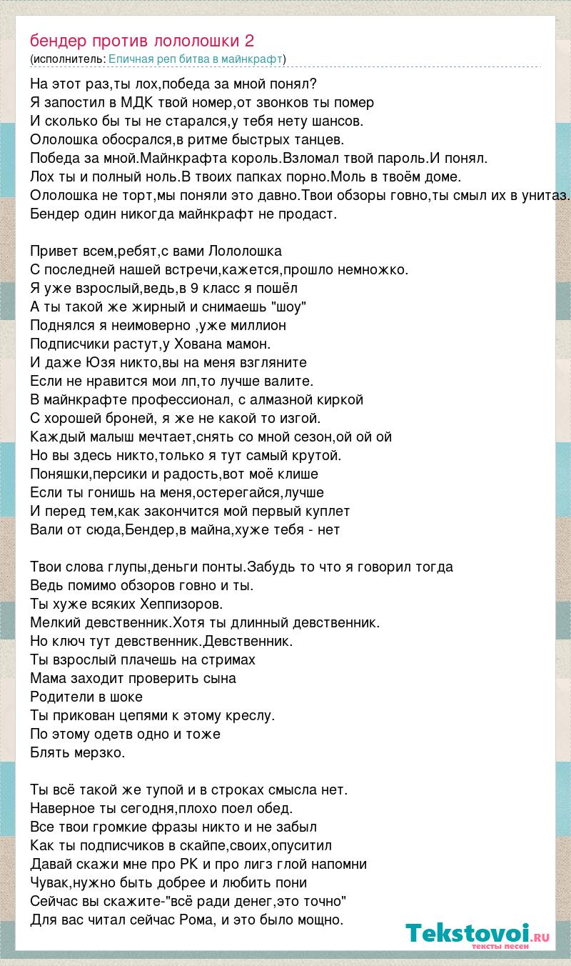 На этот раз,ты лох,победа за мной понял? Я запостил в МДК твой номер,от звонков ты помер И сколько бы ты не старался,у тебя нету шансов. Ололошка обосрался,в ритме быстрых танцев. Победа за мной.Майнкрафта король.Взломал твой пароль.И понял. Лох ты и полный ноль.В твоих папках порно.Моль в твоём доме. Ололошка не торт,мы поняли это давно.Твои обзоры говно,ты смыл их в унитаз. Бендер один никогда майнкрафт не продаст. Привет всем,ребят,с вами Лололошка С последней нашей встречи,кажется,прошло немножко. Я уже взрослый,ведь,в 9 класс я пошёл А ты такой же жирный и снимаешь "шоу" Поднялся я неимоверно ,уже миллион Подписчики растут,у Хована мамон. И даже Юзя никто,вы на меня взгляните Если не нравится мои лп,то лучше валите. В майнкрафте профессионал, с алмазной киркой С хорошей броней, я же не какой то изгой. Каждый малыш мечтает,снять со мной сезон,ой ой ой Но вы здесь никто,только я тут самый крутой. Поняшки,персики и радость,вот моё клише Если ты гонишь на меня,остерегайся,лучше И перед тем,как закончится мой первый куплет Вали от сюда,Бендер,в майна,хуже тебя - нет Твои слова глупы,деньги понты.Забудь то что я говорил тогда Ведь помимо обзоров говно и ты. Ты хуже всяких Хеппизоров. Мелкий девственник.Хотя ты длинный девственник. Но ключ тут девственник.Девственник. Ты взрослый плачешь на стримах Мама заходит проверить сына Родители в шоке Ты прикован цепями к этому креслу. По этому одетв одно и тоже Блять мерзко. Ты всё такой же тупой и в строках смысла нет. Наверное ты сегодня,плохо поел обед. Все твои громкие фразы никто и не забыл Как ты подписчиков в скайпе,своих,опуситил Давай скажи мне про РК и про лигз глой напомни Чувак,нужно быть добрее и любить пони Сейчас вы скажите-"всё ради денег,это точно" Для вас читал сейчас Рома, и это было мощно.