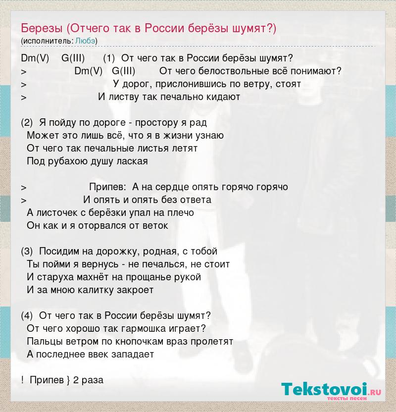 Dm(V) G(III) (1) От чего так в России берёзы шумят? > Dm(V) G(III) От чего белоствольные всё понимают? > У дорог, прислонившись по ветру, стоят > И листву так печально кидают (2) Я пойду по дороге - простору я рад Может это лишь всё, что я в жизни узнаю От чего так печальные листья летят Под рубахою душу лаская > Припев: А на сердце опять горячо горячо > И опять и опять без ответа А листочек с берёзки упал на плечо Он как и я оторвался от веток (3) Посидим на дорожку, родная, с тобой Ты пойми я вернусь - не печалься, не стоит И старуха махнёт на прощанье рукой И за мною калитку закроет (4) От чего так в России берёзы шумят? От чего хорошо так гармошка играет? Пальцы ветром по кнопочкам враз пролетят А последнее ввек западает ! Припев } 2 раза